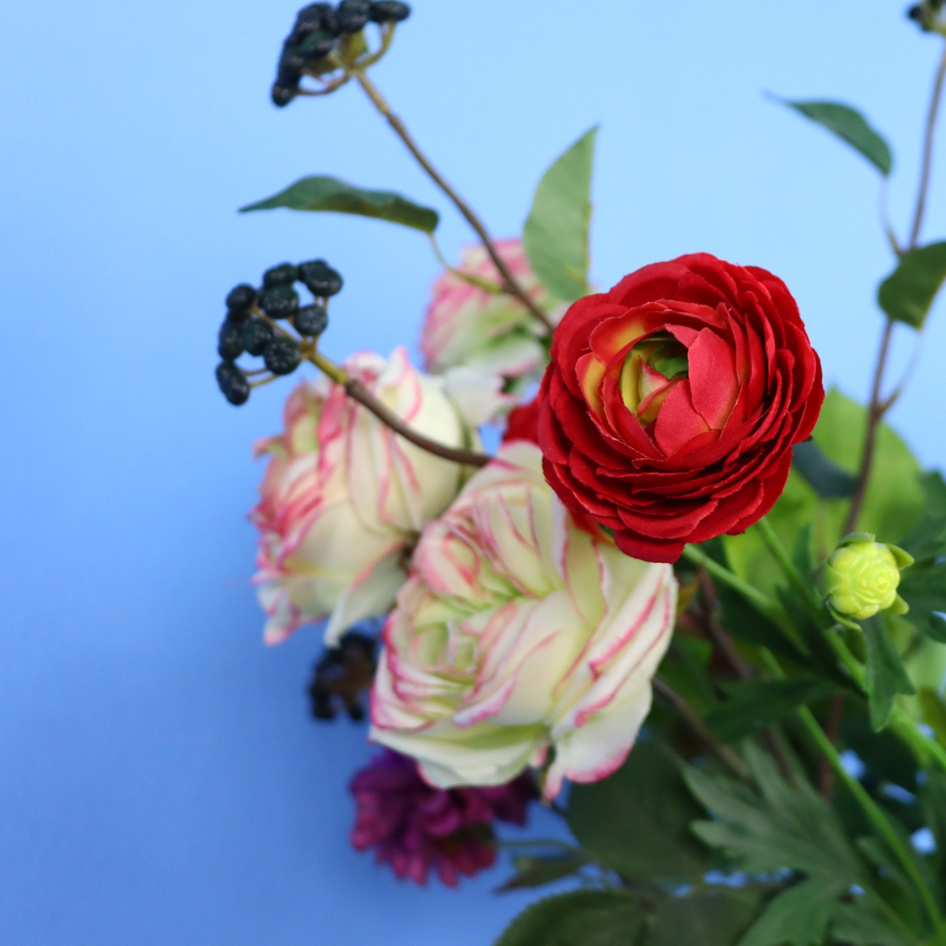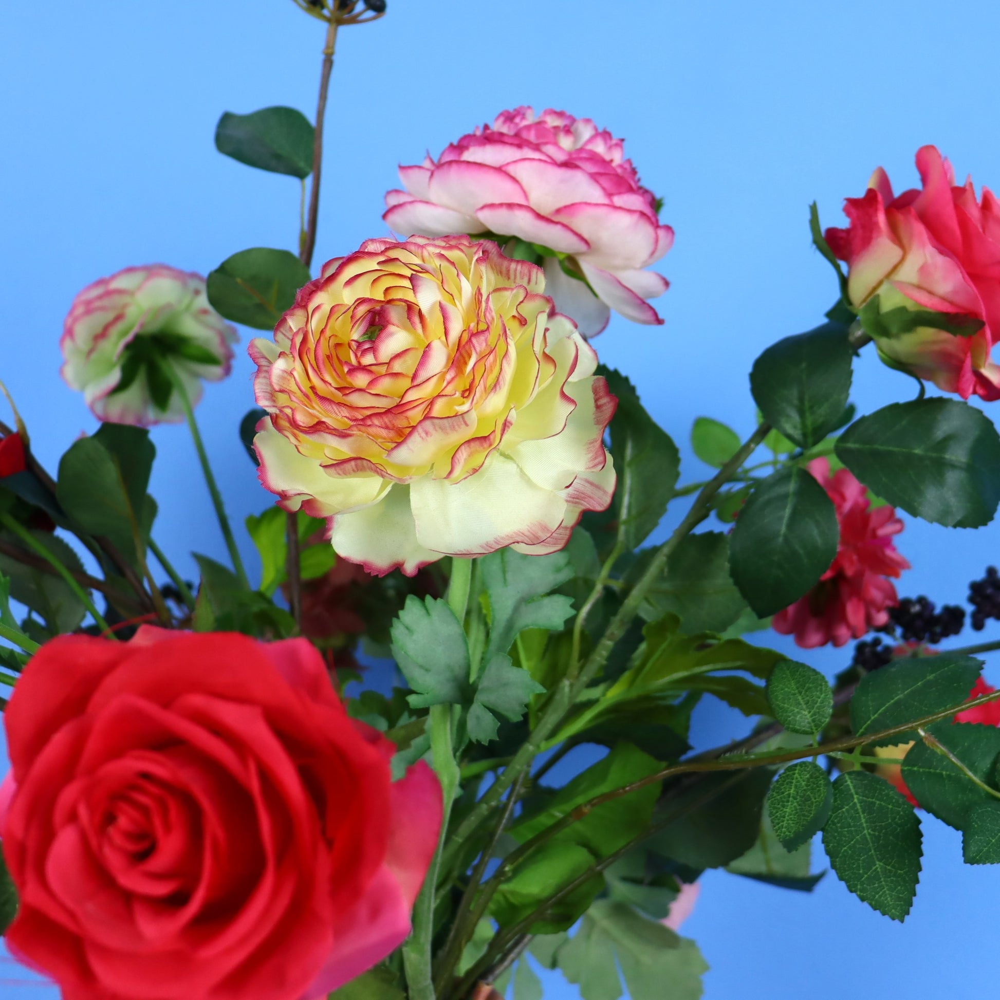 Deze kegelvormige eye-catcher komt met een boeket van rozen, ranonkels en dahlia's.