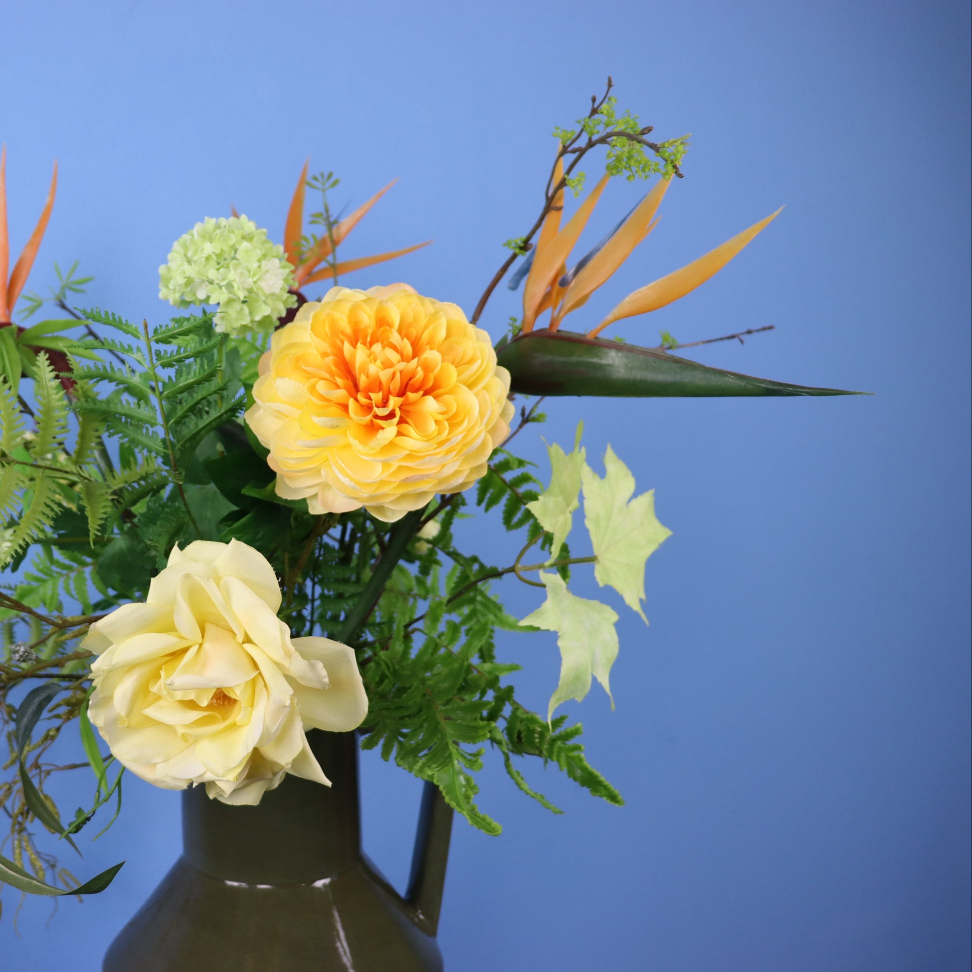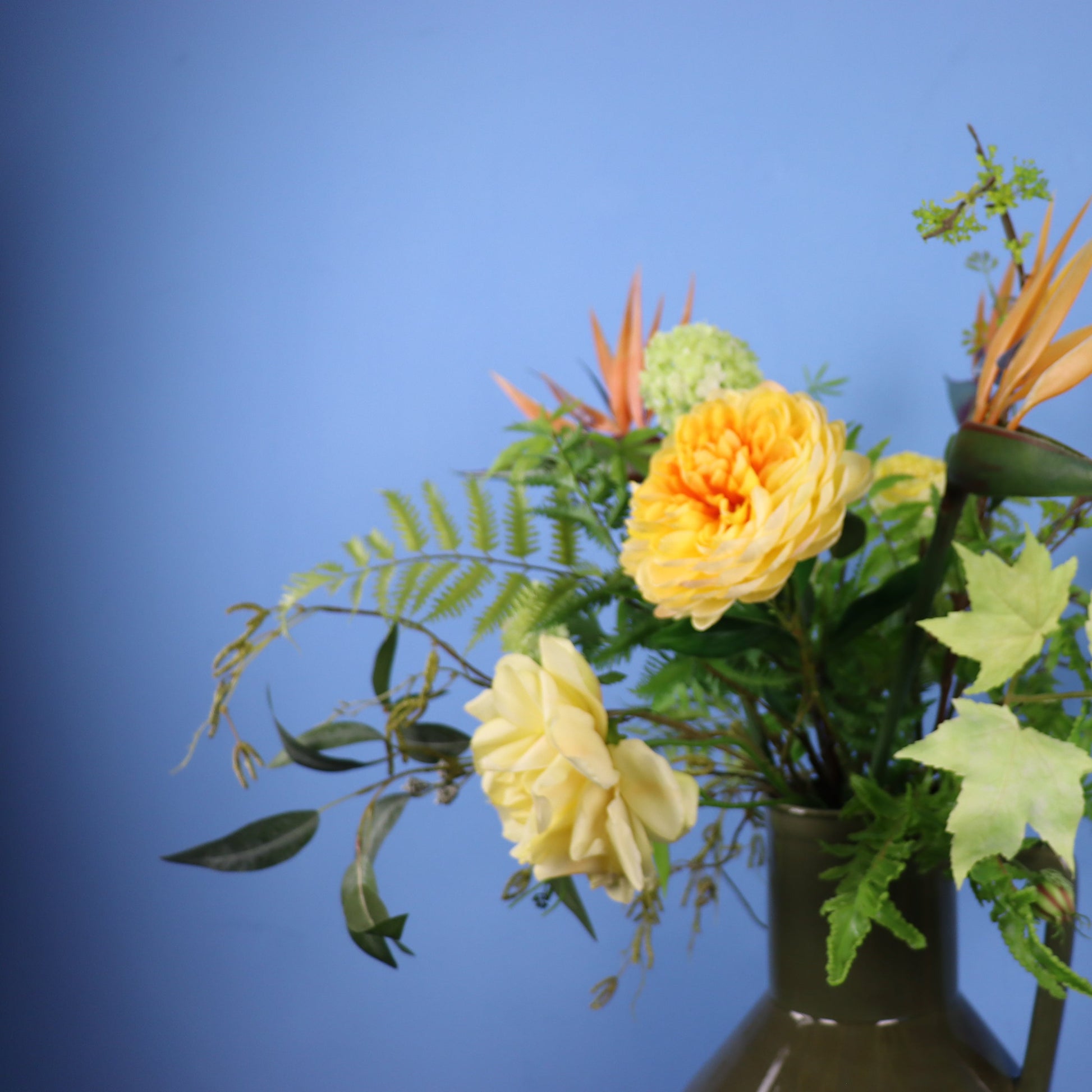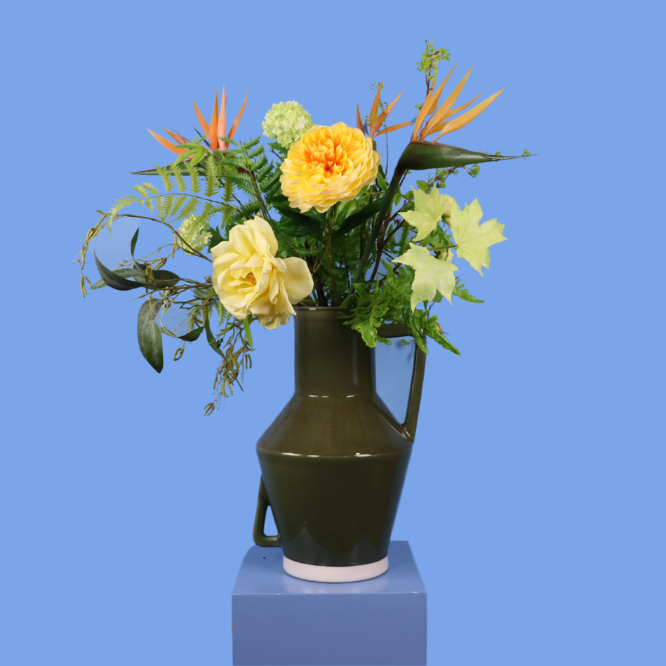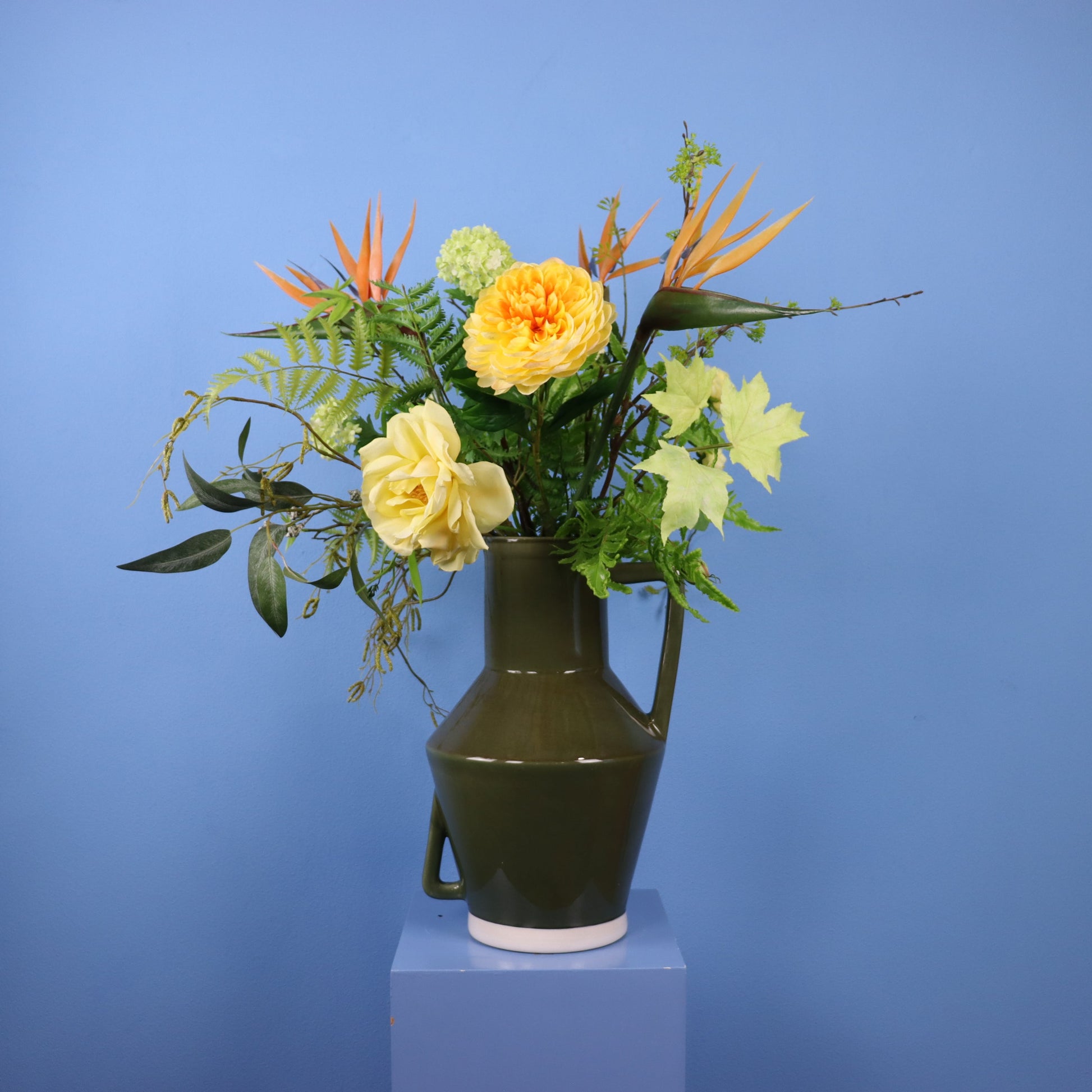 Deze groene vaas van Return to Sender is gevuld met een herfstboeket met bloemen in de kleuren geel, oranje en wit.