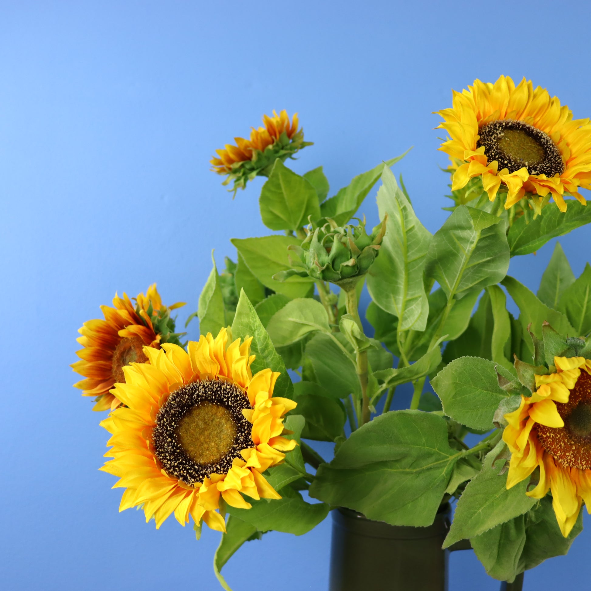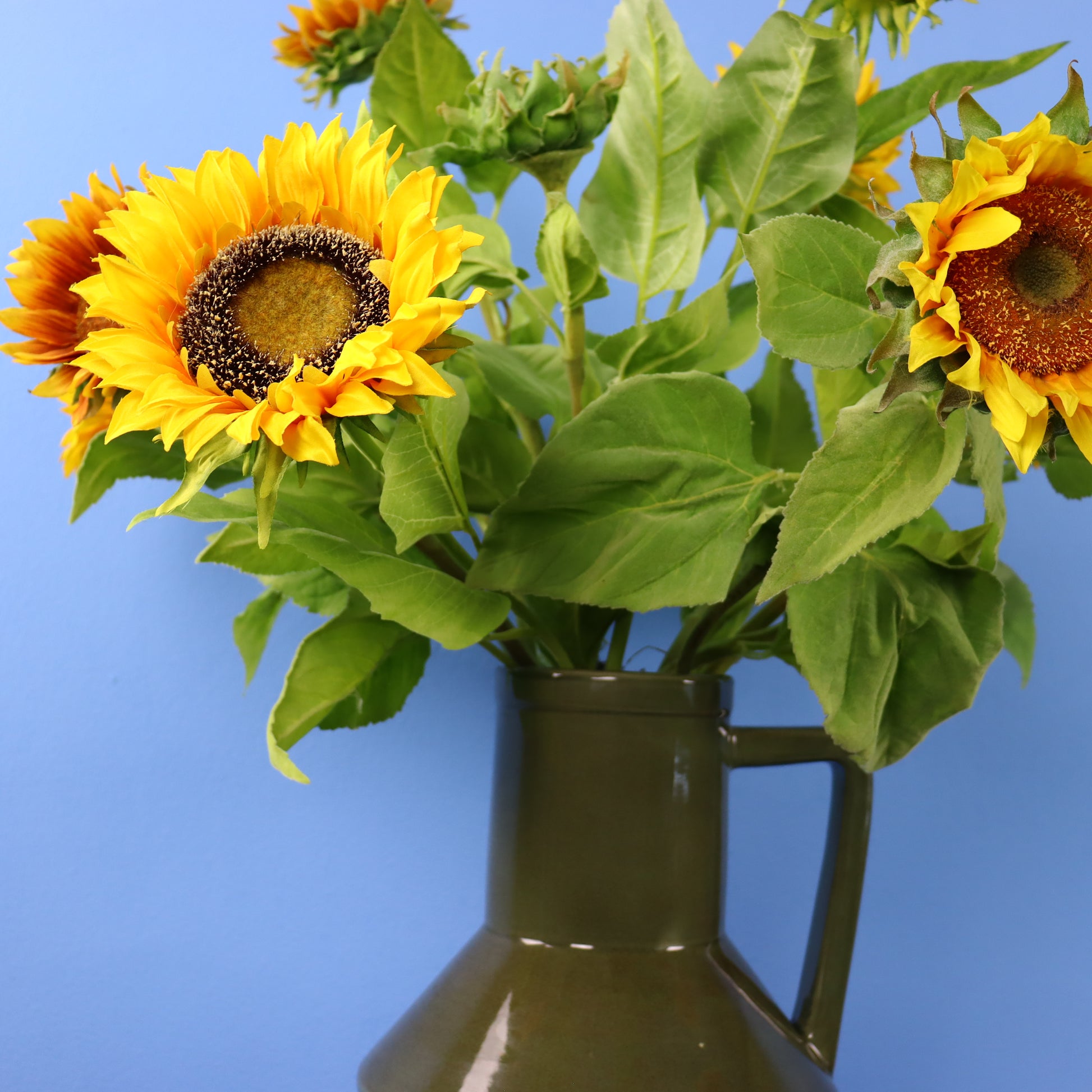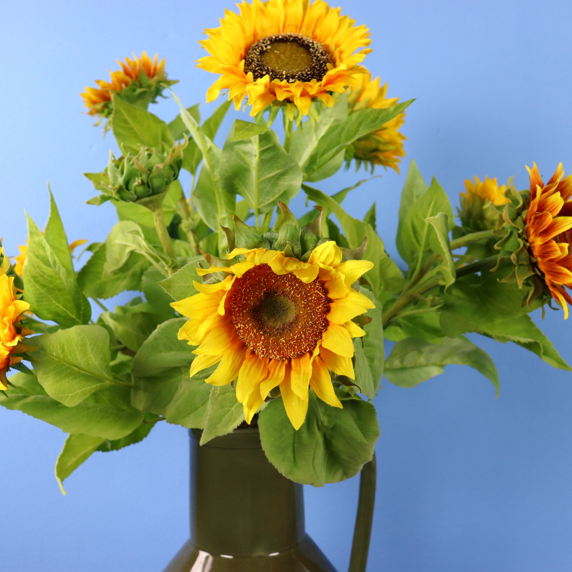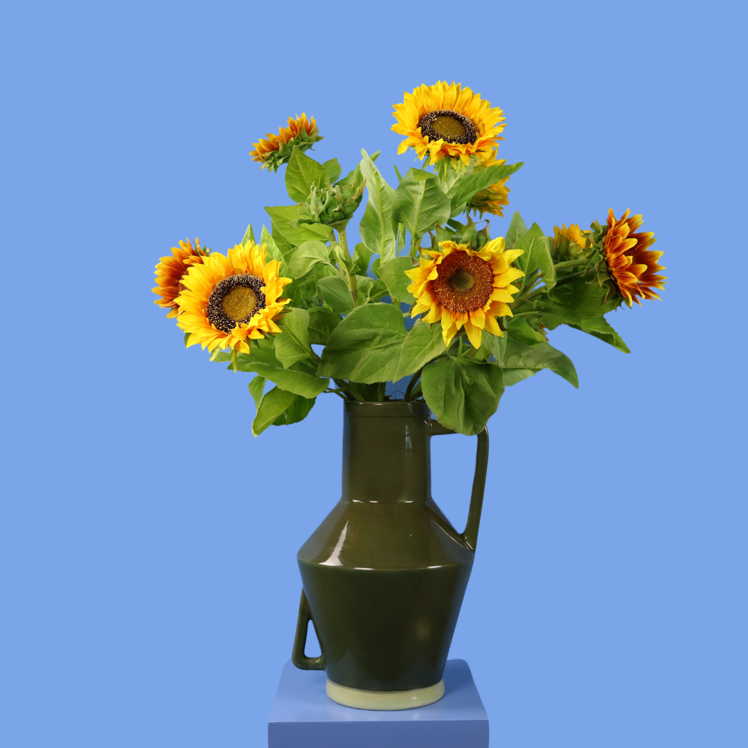 Donkergroene Return to Sender vaas gevuld met zonnebloemen.