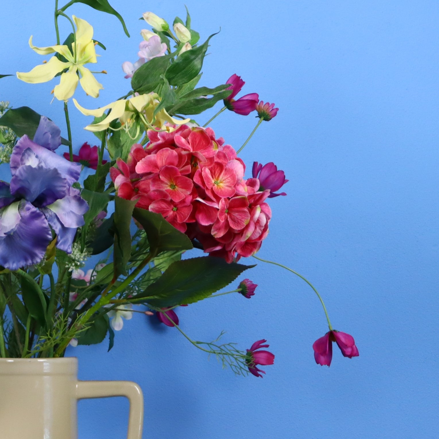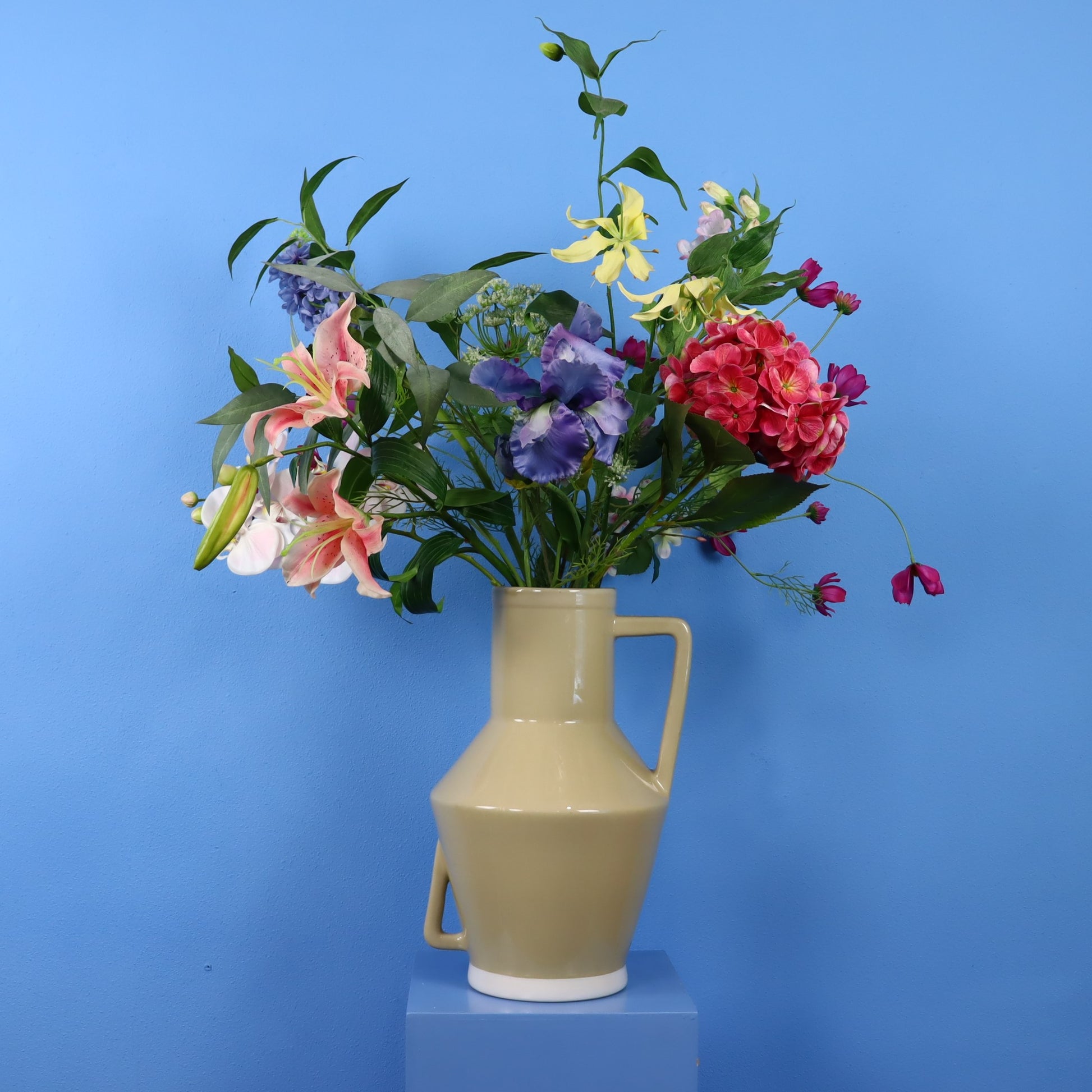 Deze beige Return to Sender vaas komt met een oranje met groene bos bloemen, zoals dahlia's en paradijsvogelbloem / strelitzia.