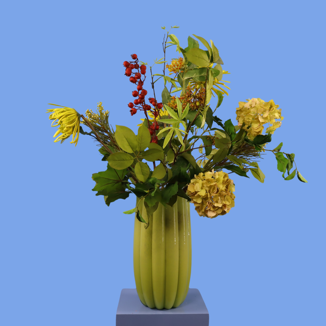 Glazen Melon vase van POLSPOTTEN met blijvende bloemen.
