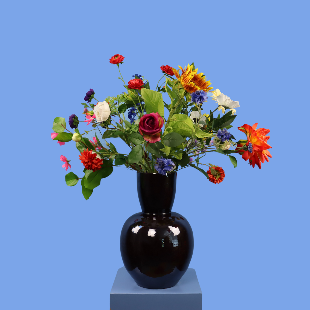Donkerbruine Serax vaas gevuld met een vrolijk boeket.