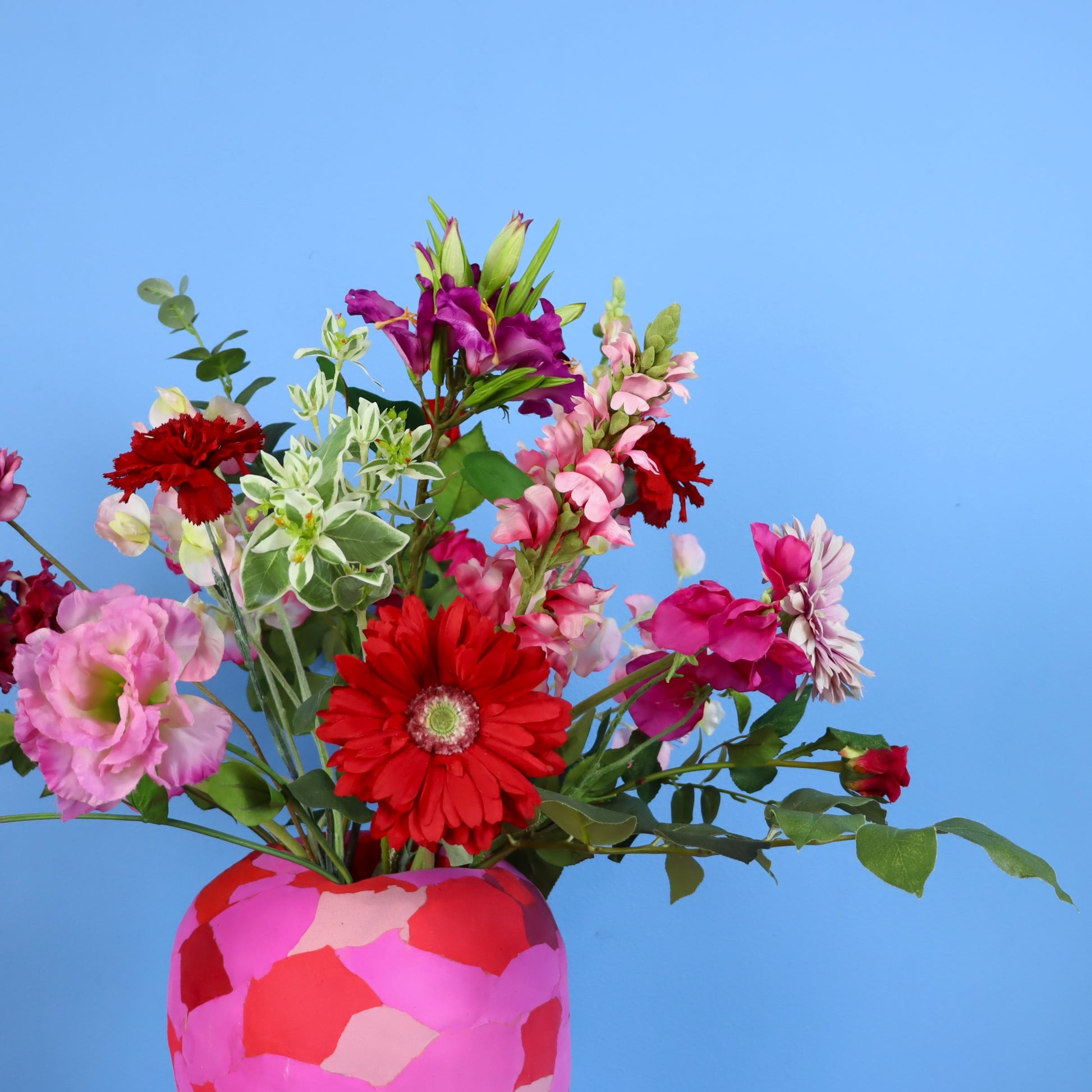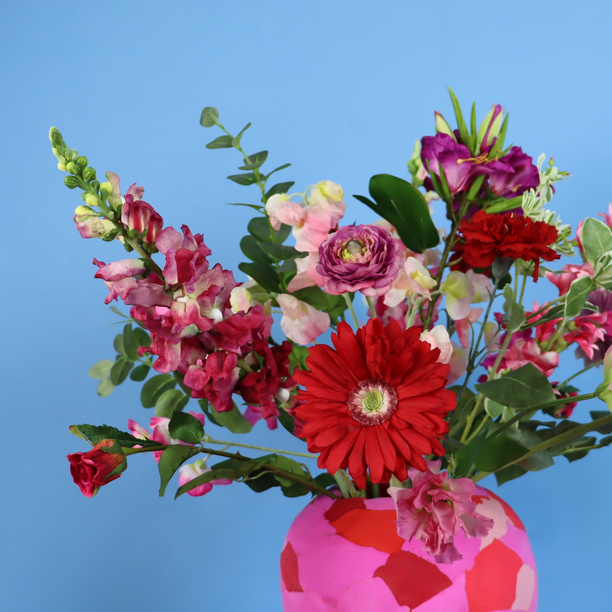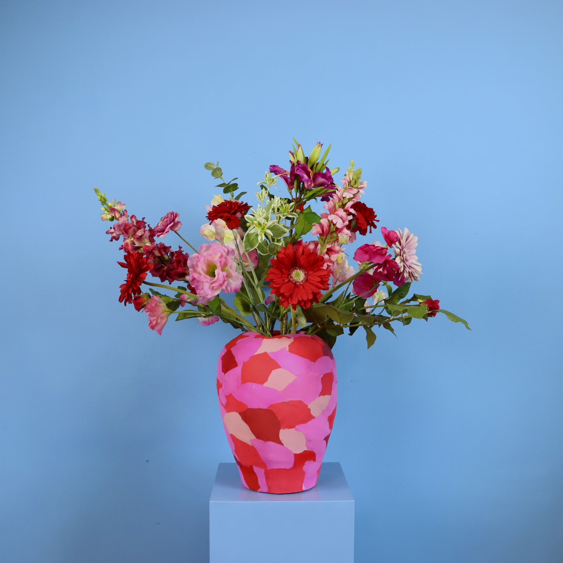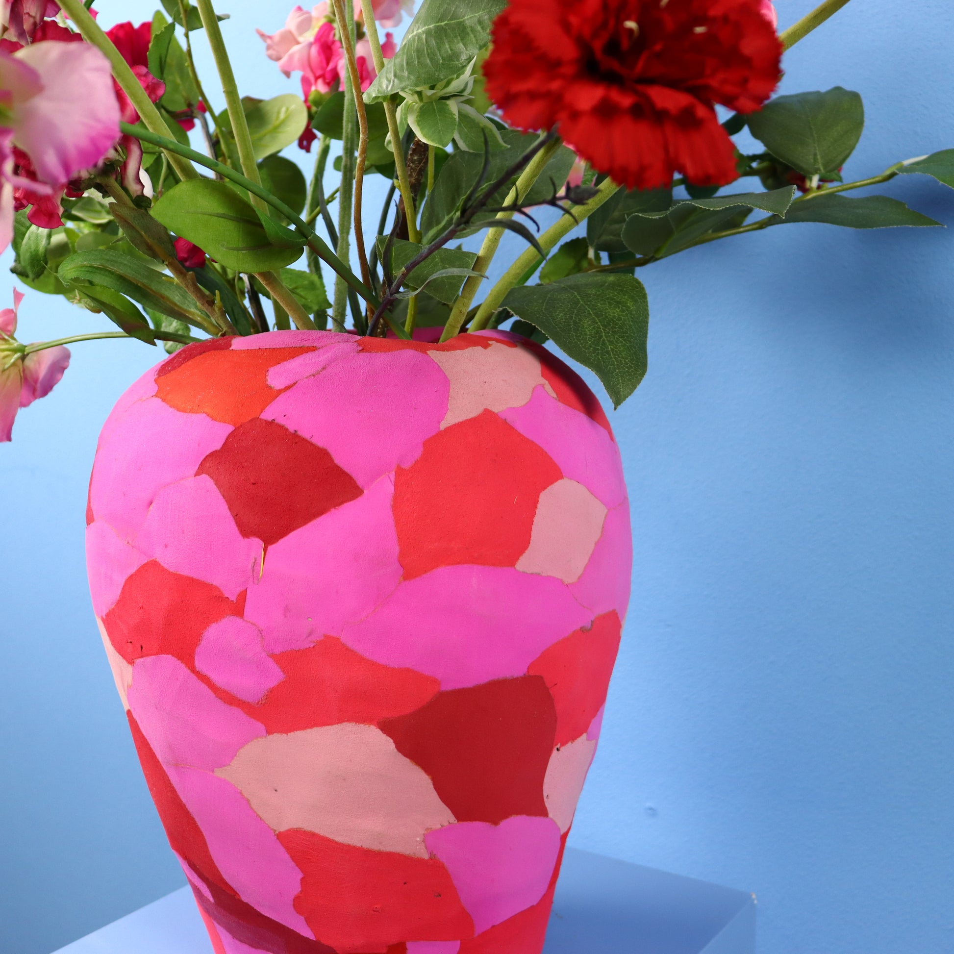 Dit is een Ocean Sole vaas. Door gebruik te maken van gerecyclede flip-flops die zijn verzameld in ontwikkelingslanden, draagt deze Ocean Sole vaas bij aan het creëren van werkgelegenheid in Kenia. Deze speciale vaas komt met een bos blijvende roze, paarse en rode bloemen.