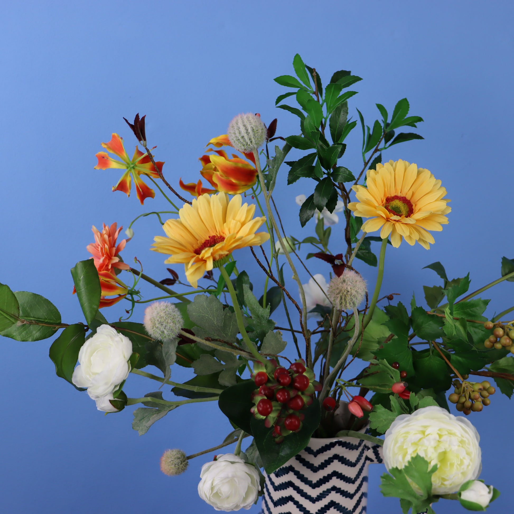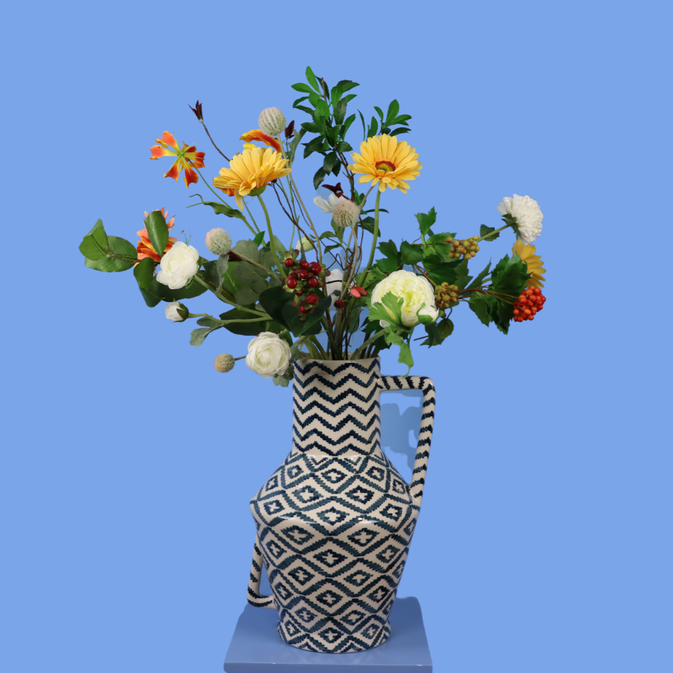 Prachtige handbeschilderde vaas van Return to Sender met blijvende bloemen in geel, oranje en paars.