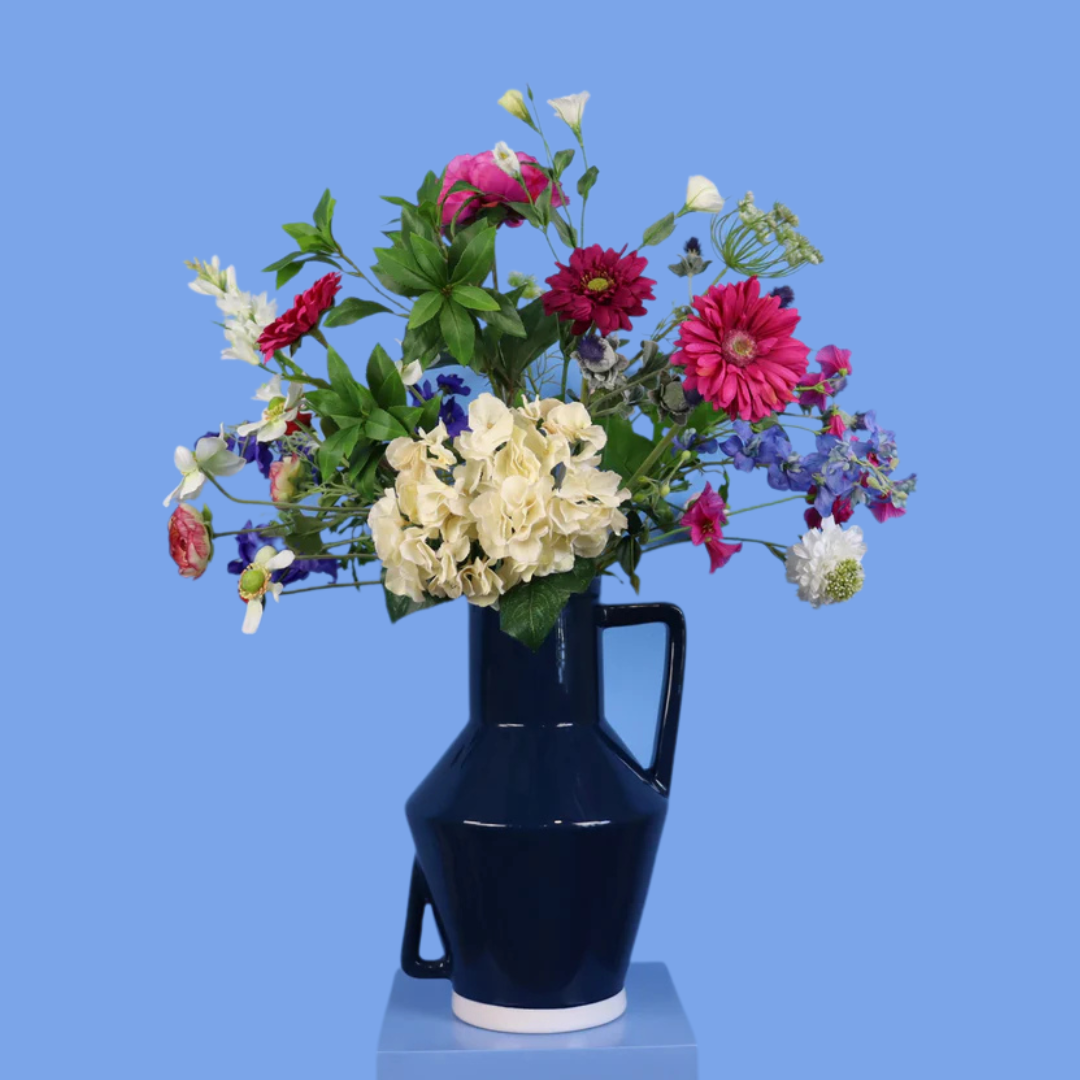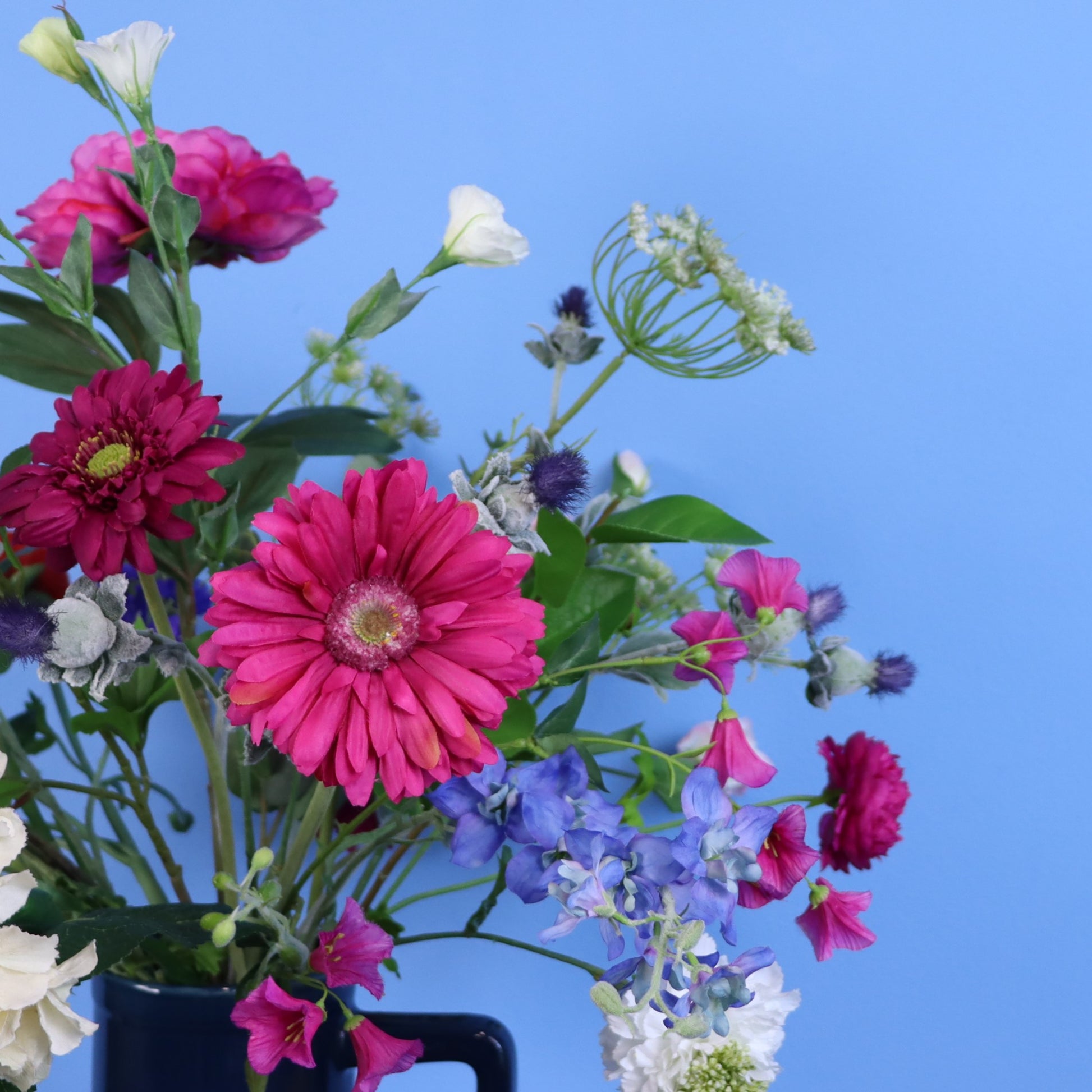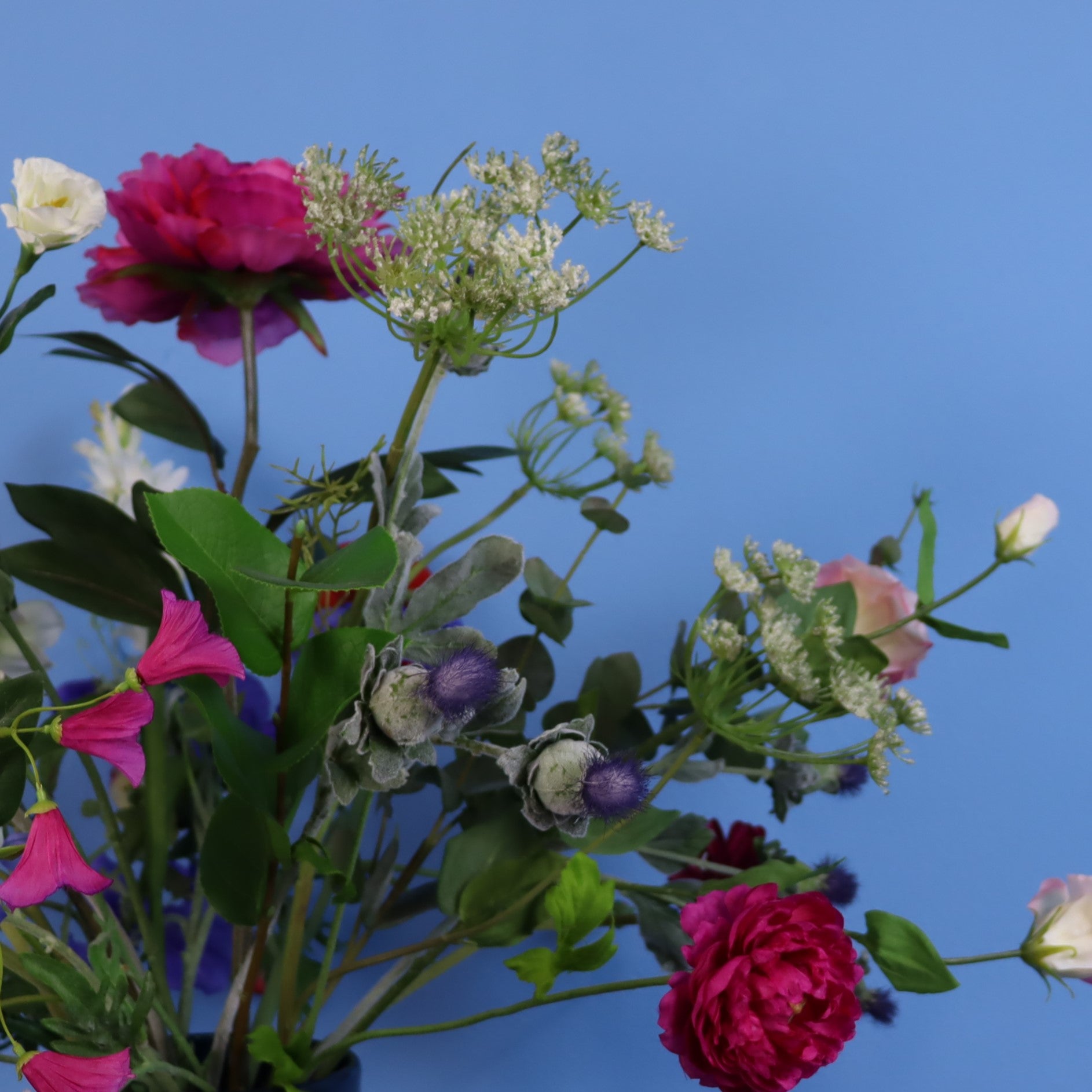 Prachtige Return to Sender vaas met een wilde bos blijvende bloemen in roze en paars.