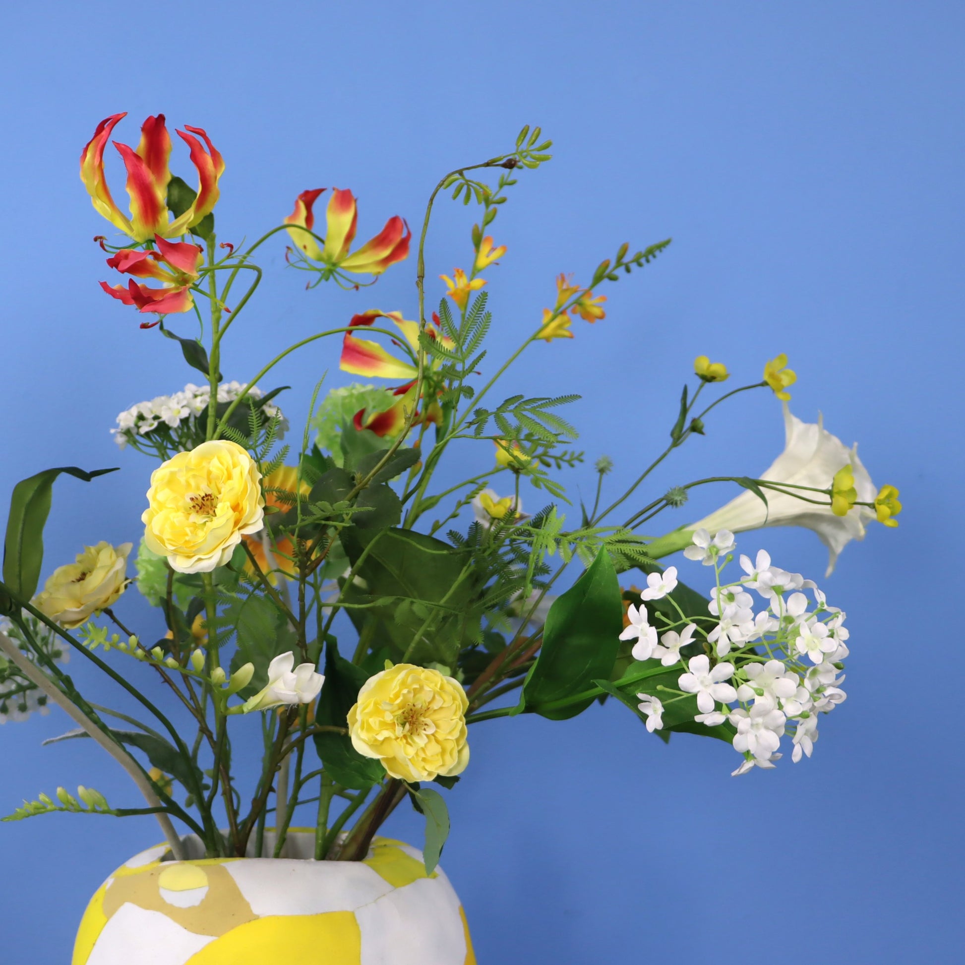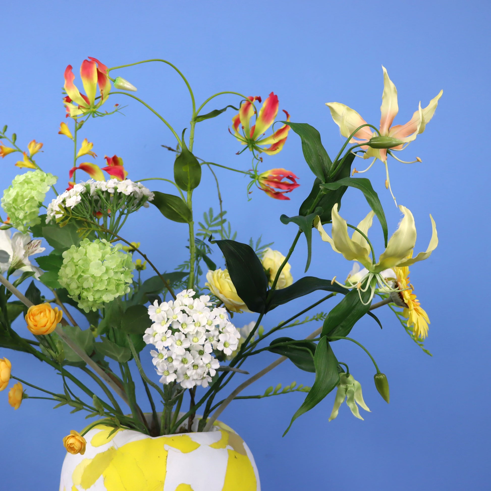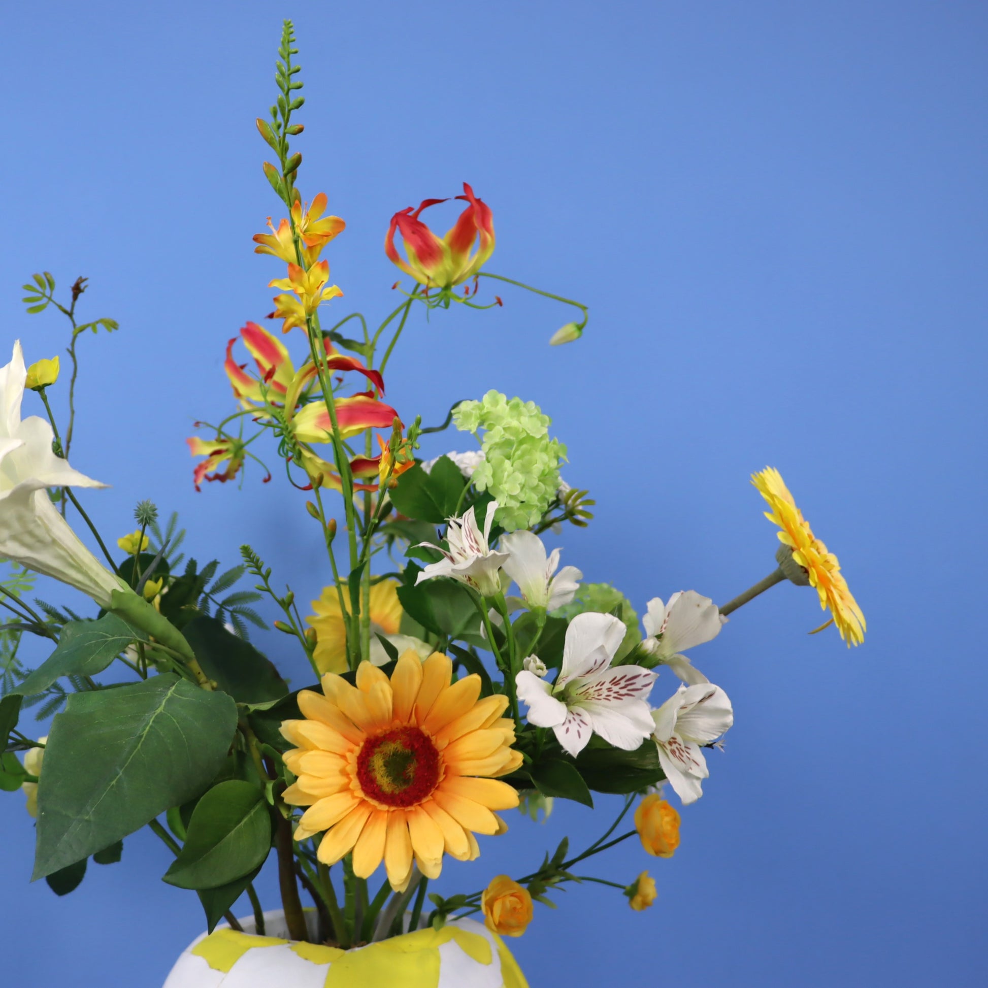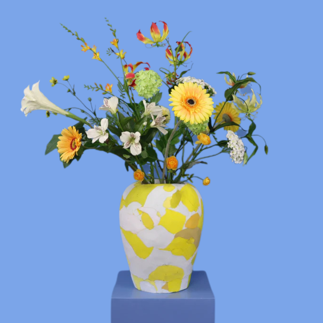 Dit is een Ocean Sole vaas. Door gebruik te maken van gerecyclede flip-flops die zijn verzameld in ontwikkelingslanden, draagt deze Ocean Sole vaas bij aan het creëren van werkgelegenheid in Kenia. Deze speciale vaas komt met een bos blijvende witte en gele bloemen.