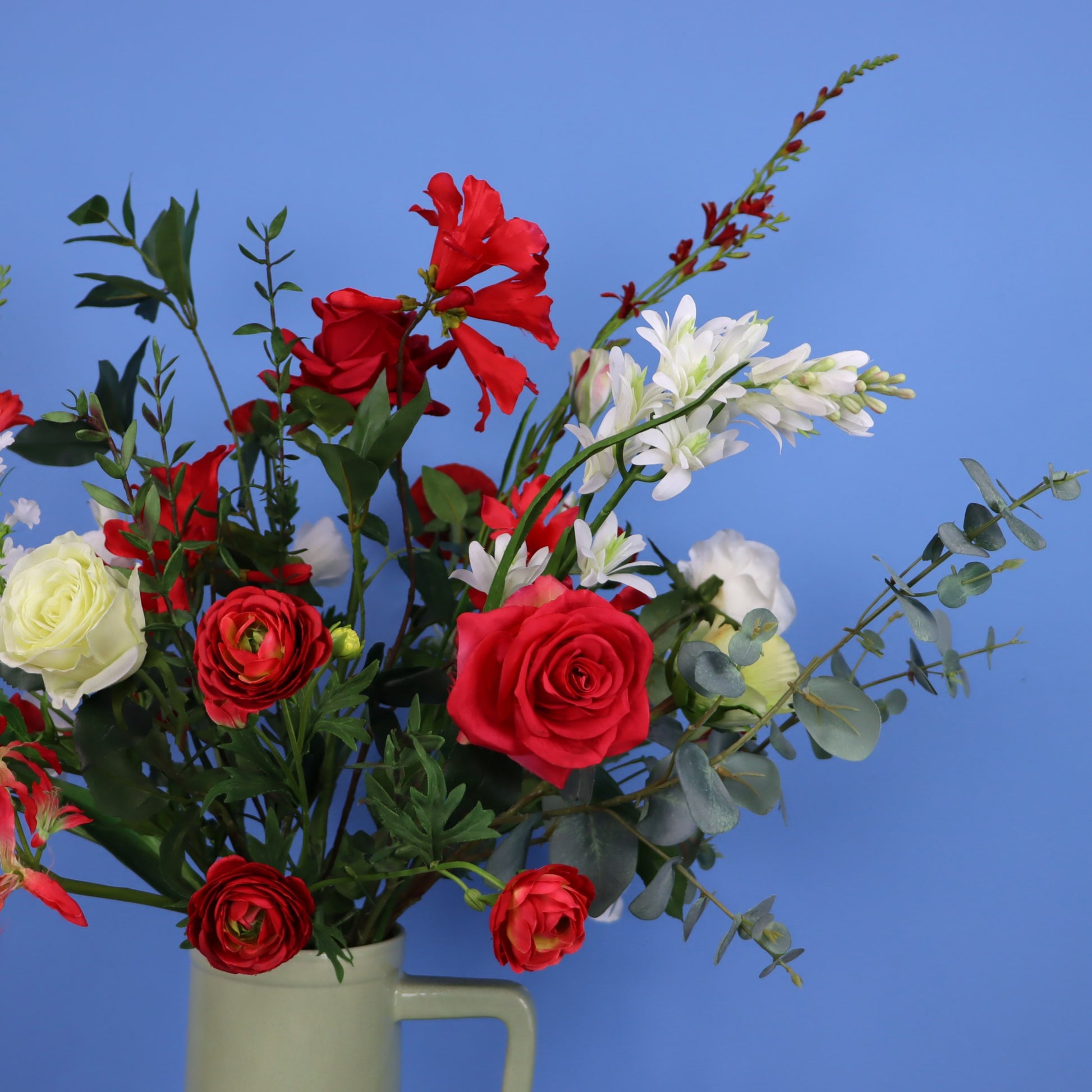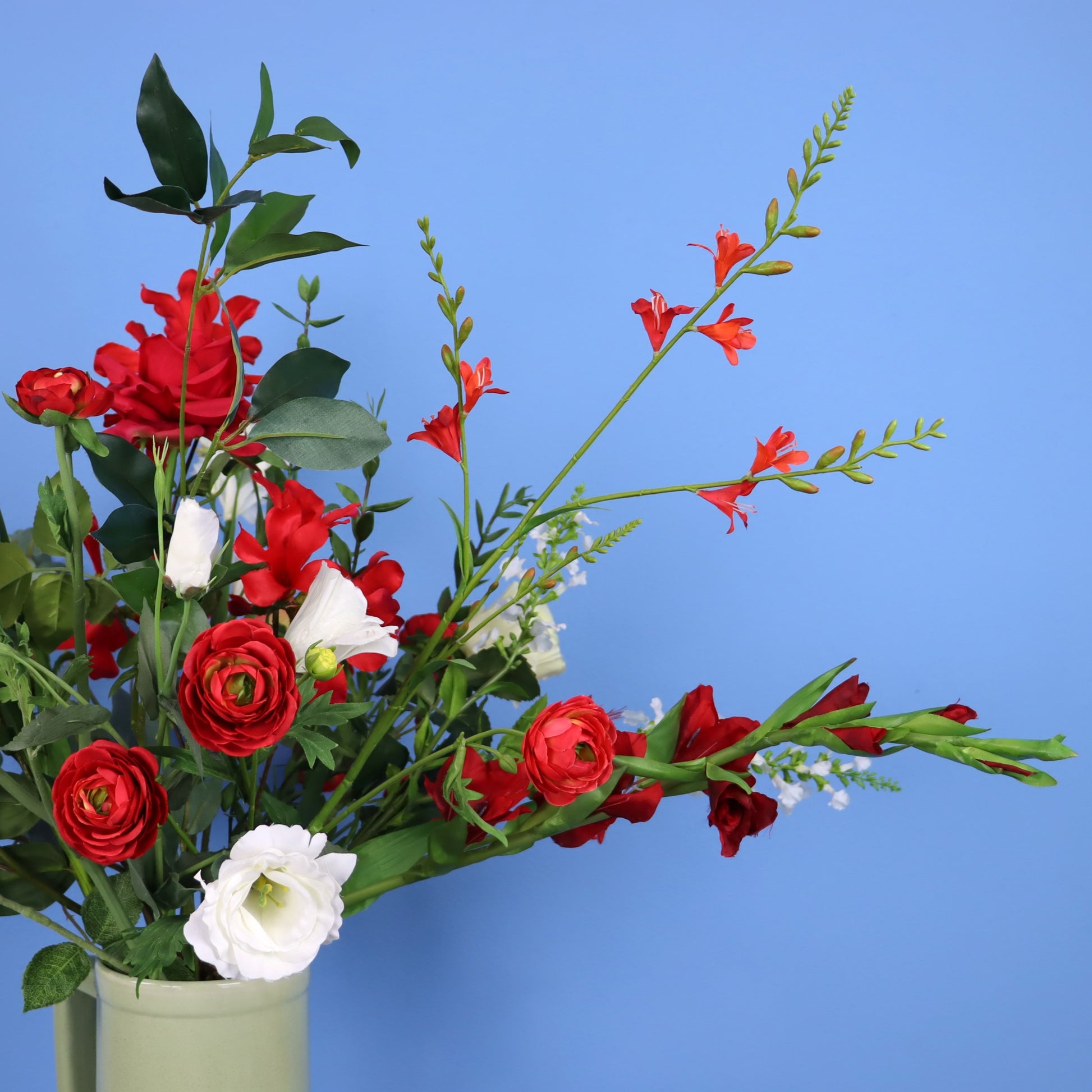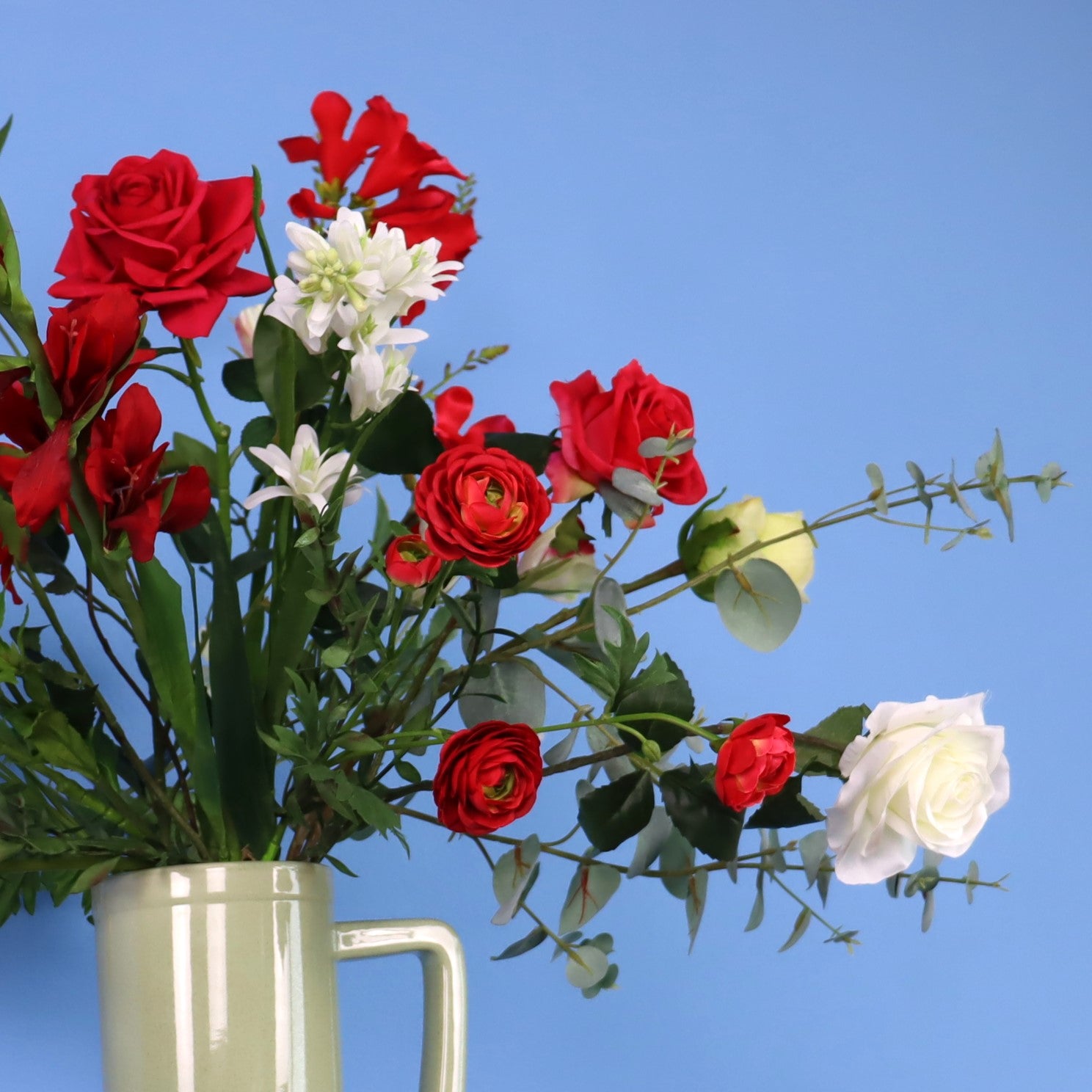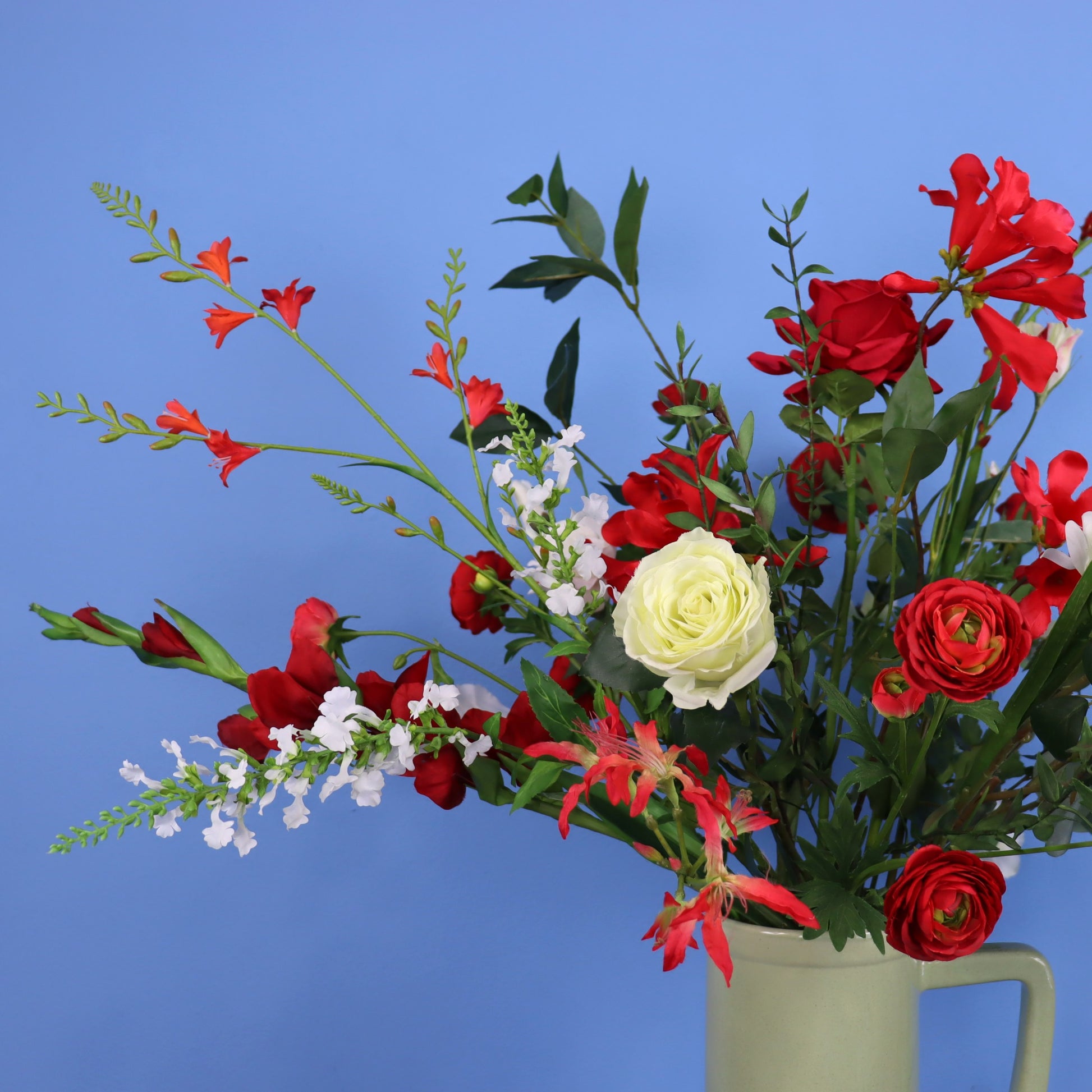 Return to Sender vaas met een boeket van diverse rode en witte bloemen.