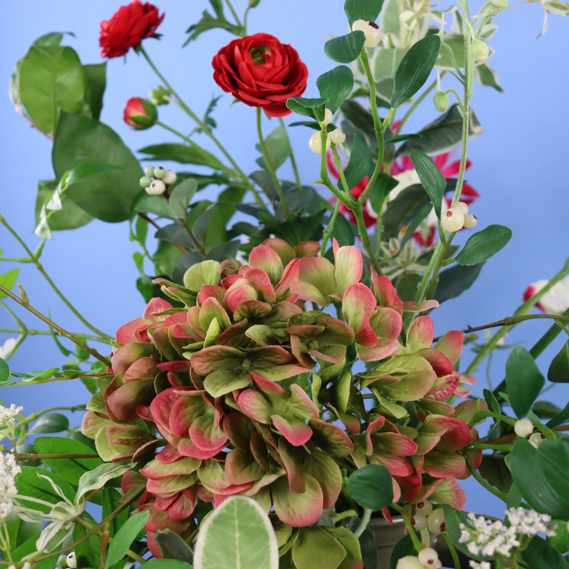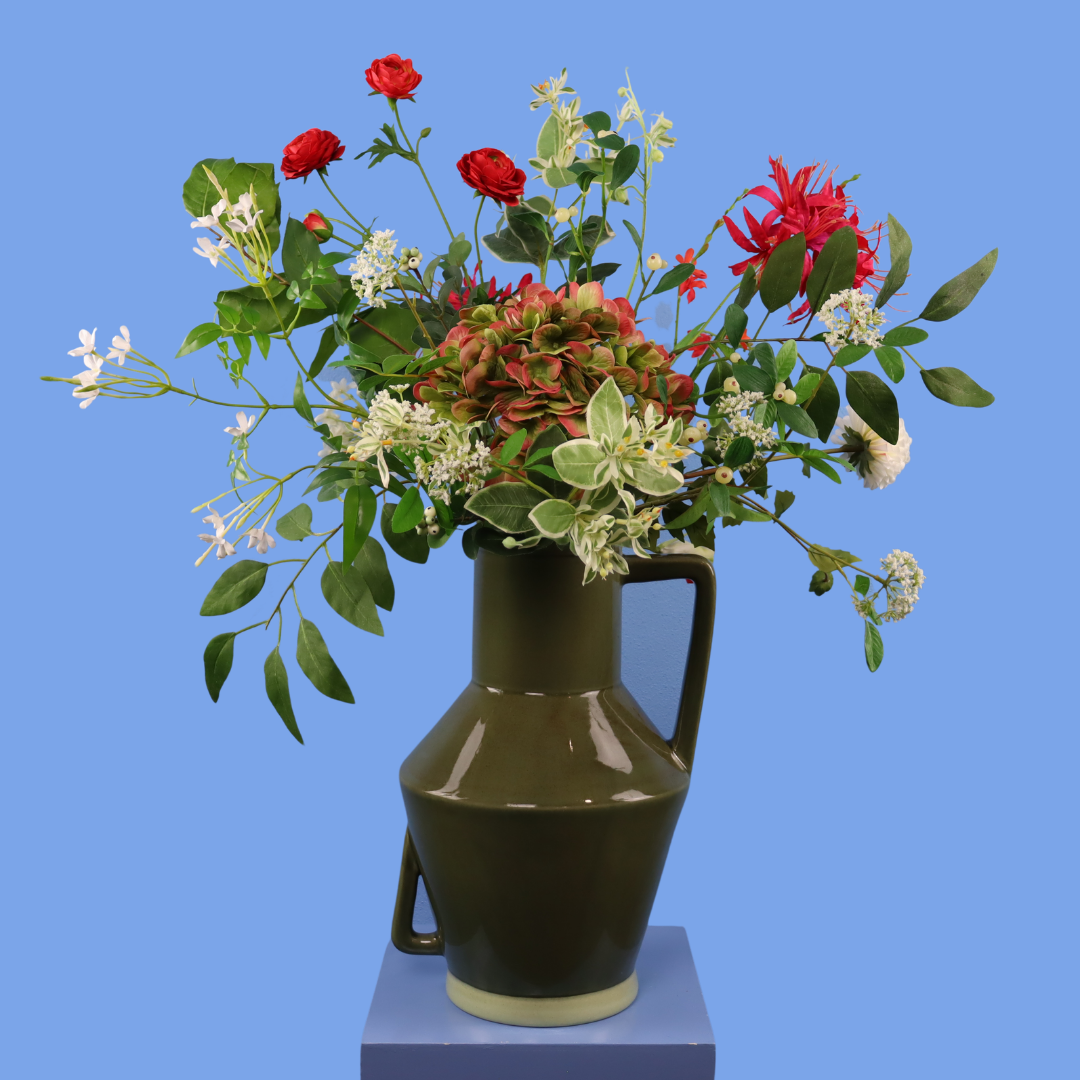 Een prachtige donkergroene Return to Sender vaas met vrolijke rode, roze en groene bloemen.