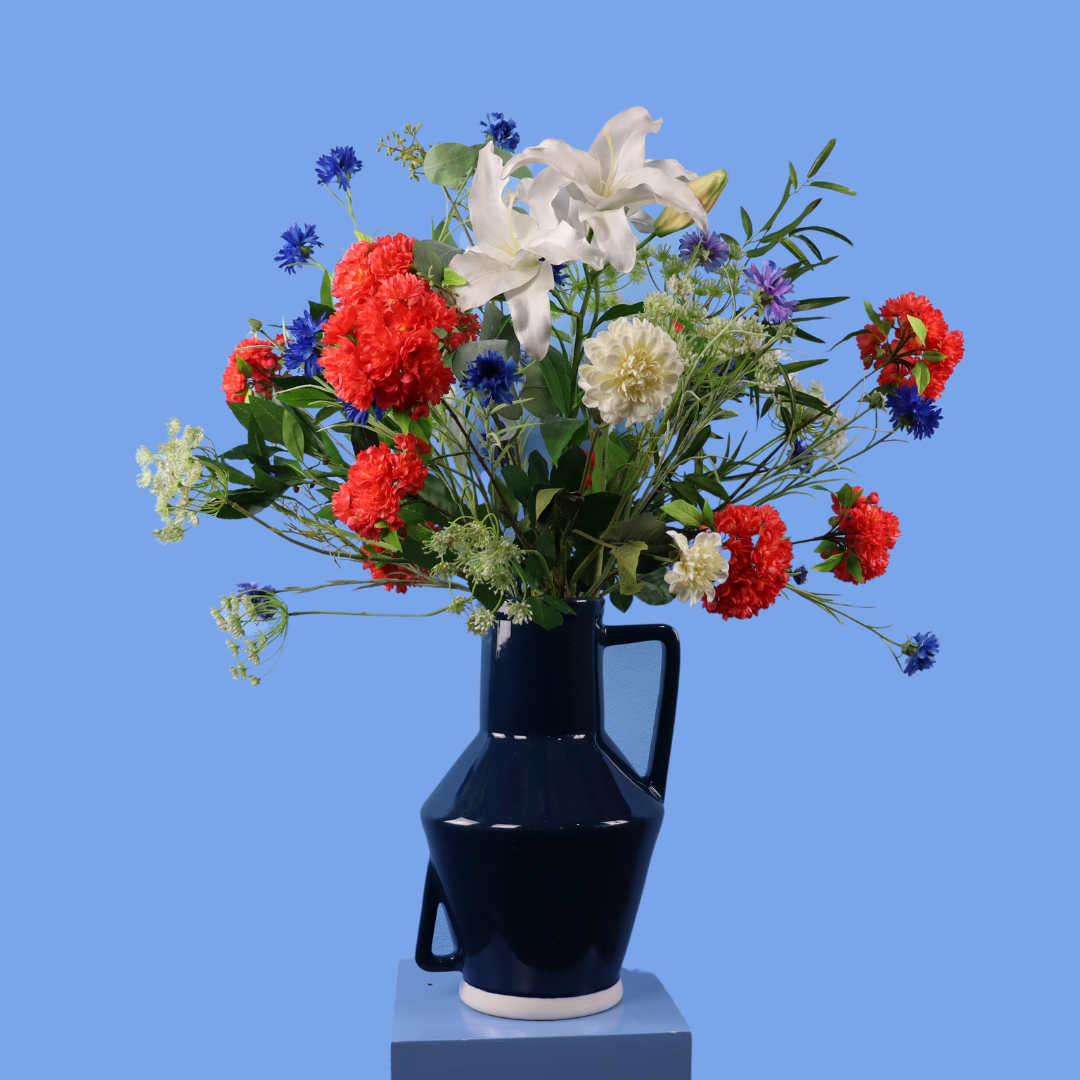 Donkerblauwe Return to Sender vaas, gevuld met oranje, gele, rode, witte en blauwe blijvende bloemen.