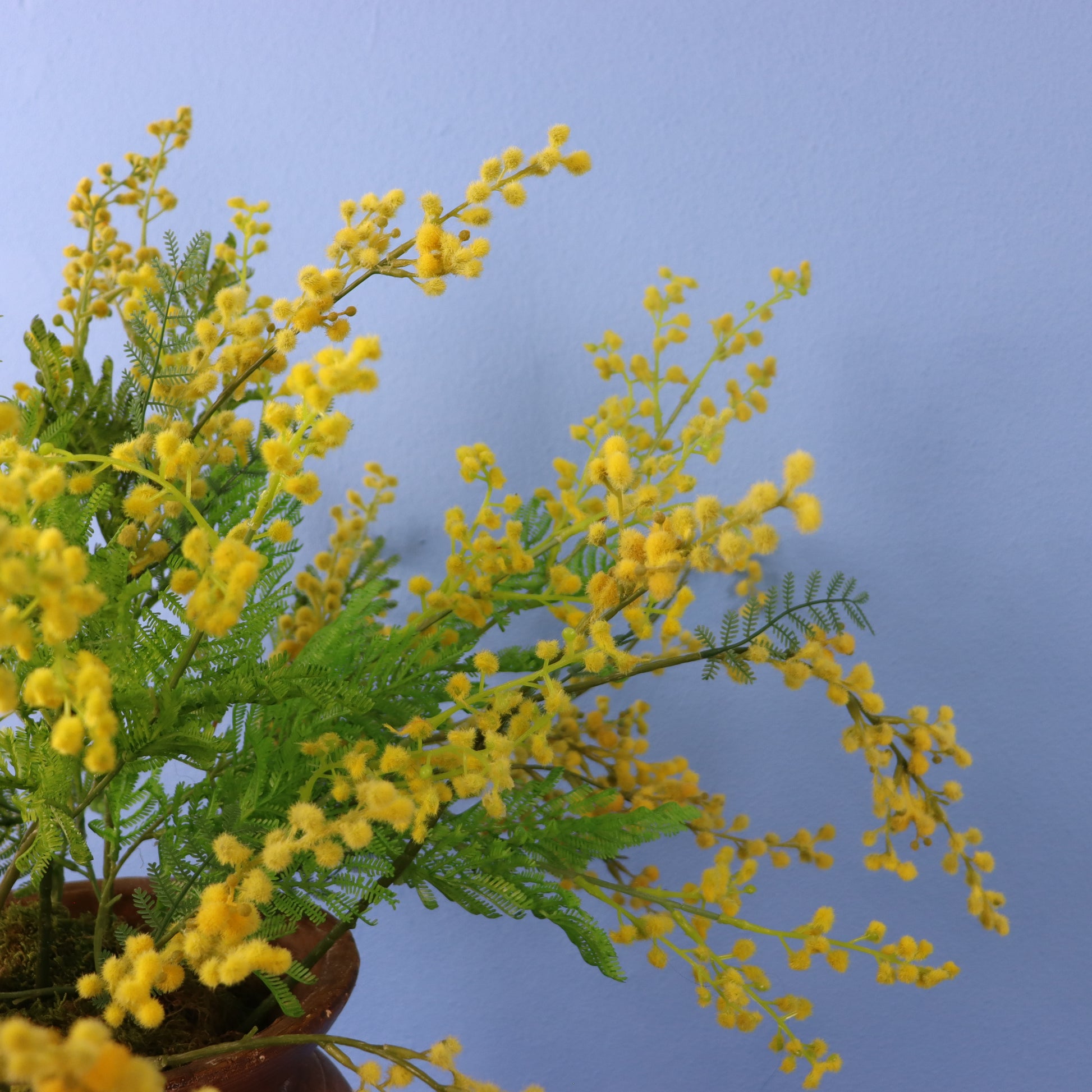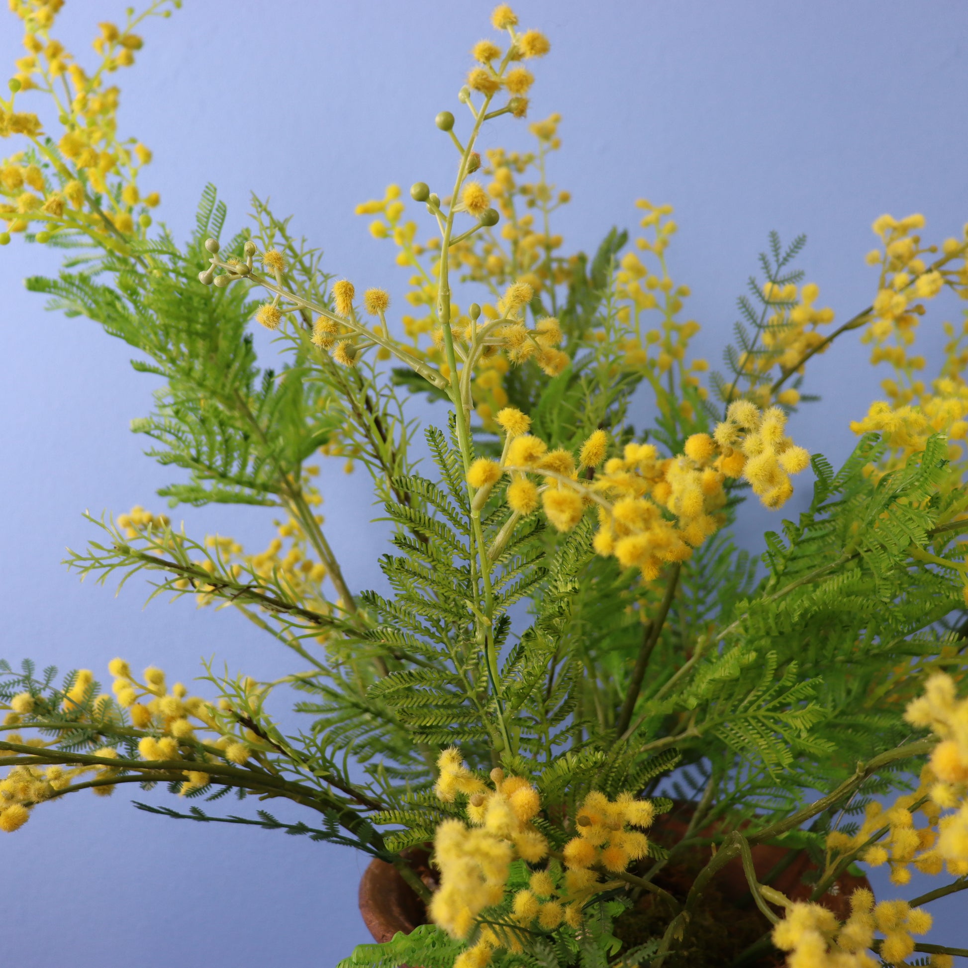 Stenen pot met vrolijk boeket van blijvende bloemen.