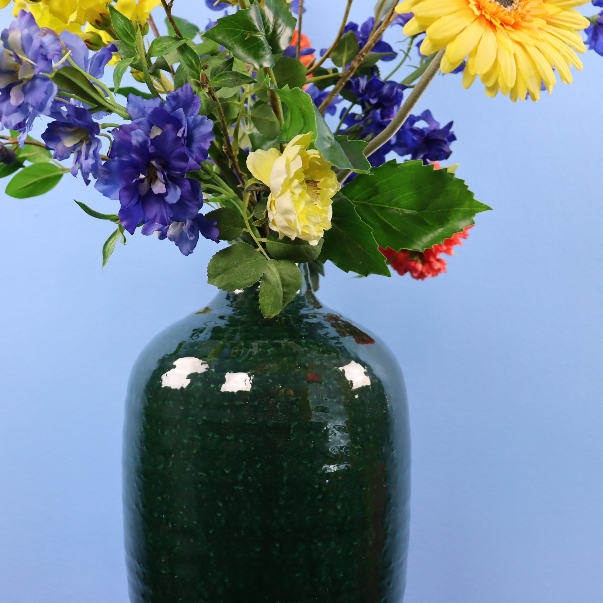 Deze donkergroene vaas van het merk Serax is gevuld met bloesem.