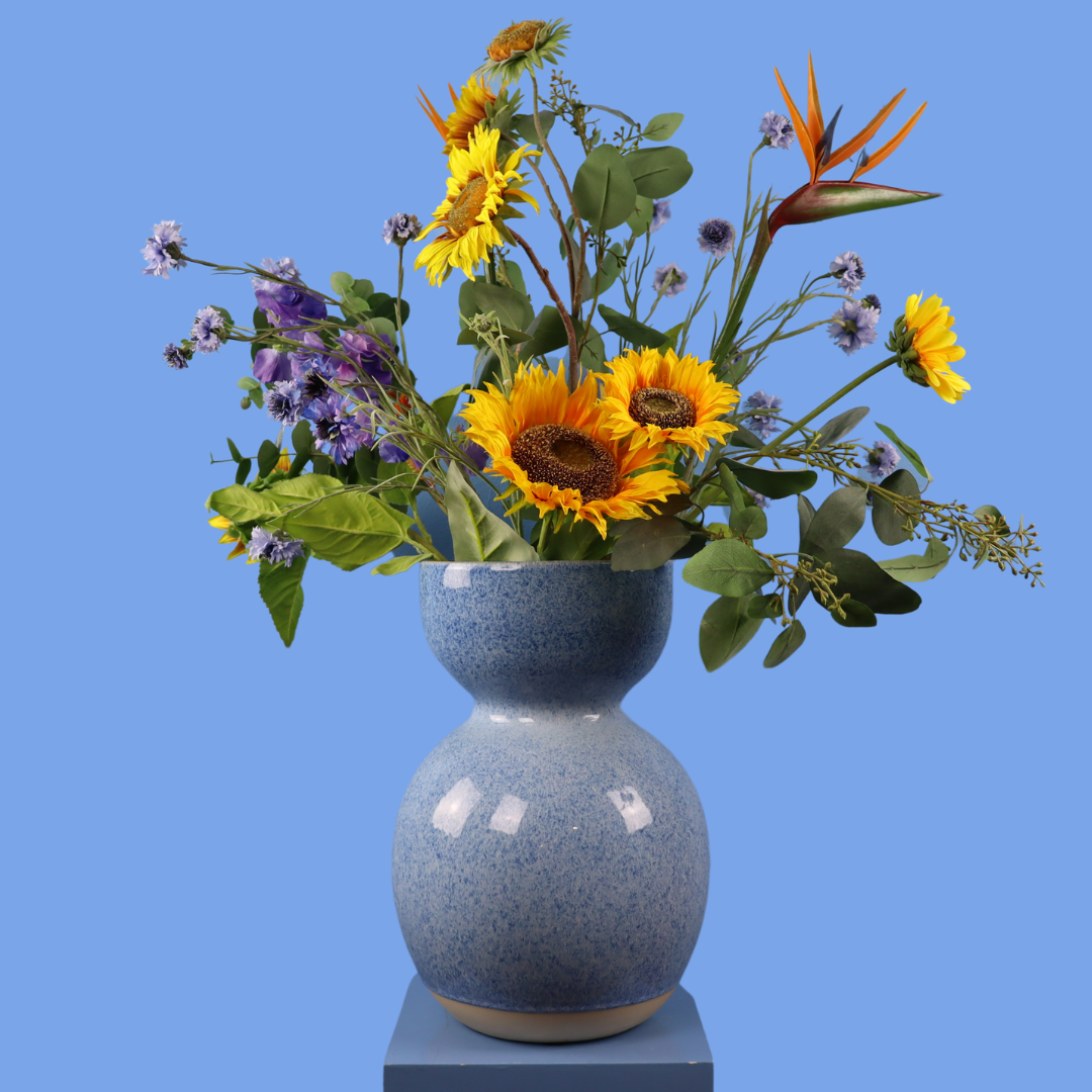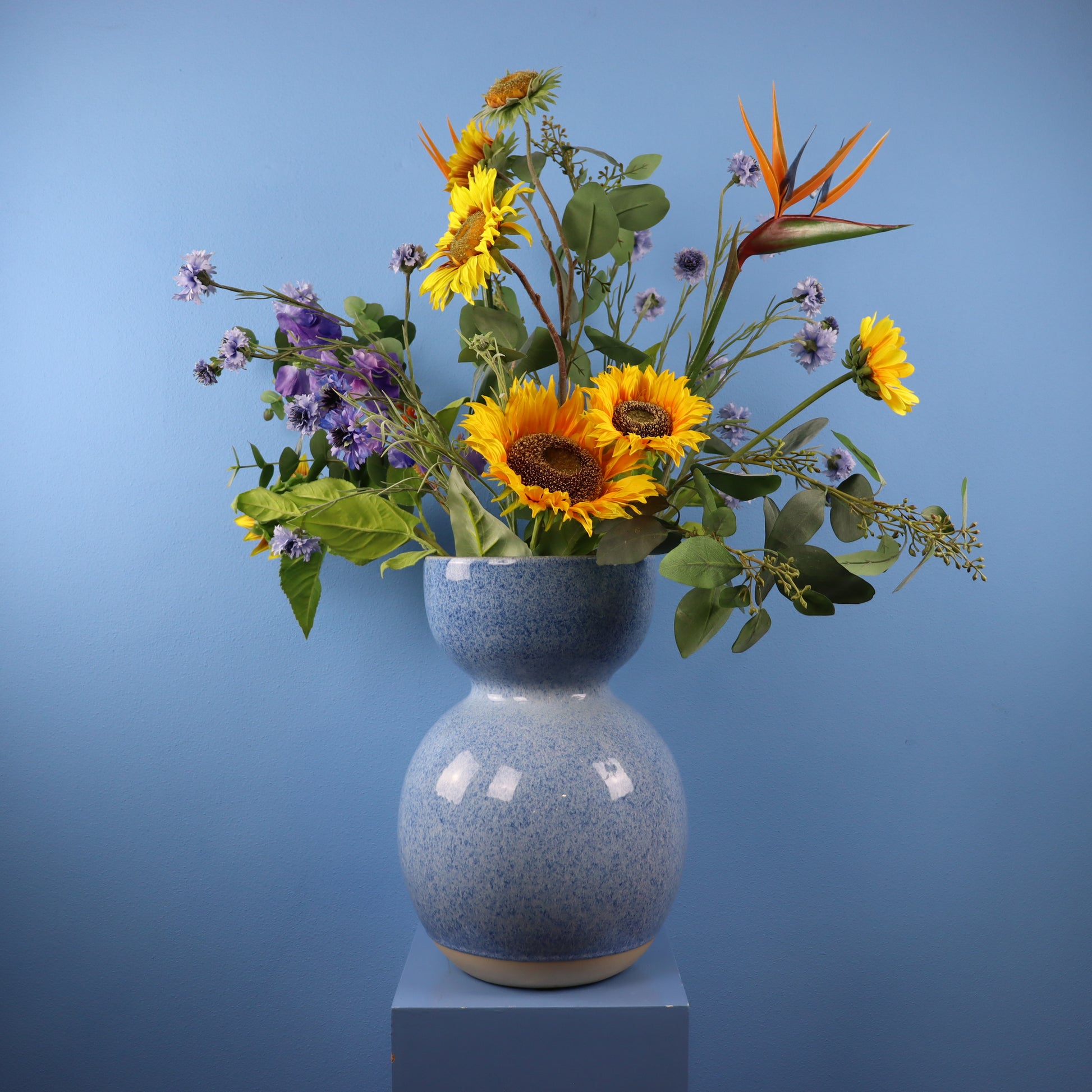 Deze blauwe vaas van Polspotten bevat een mix van blijvende bloemen in de kleuren paars, geel en oranje