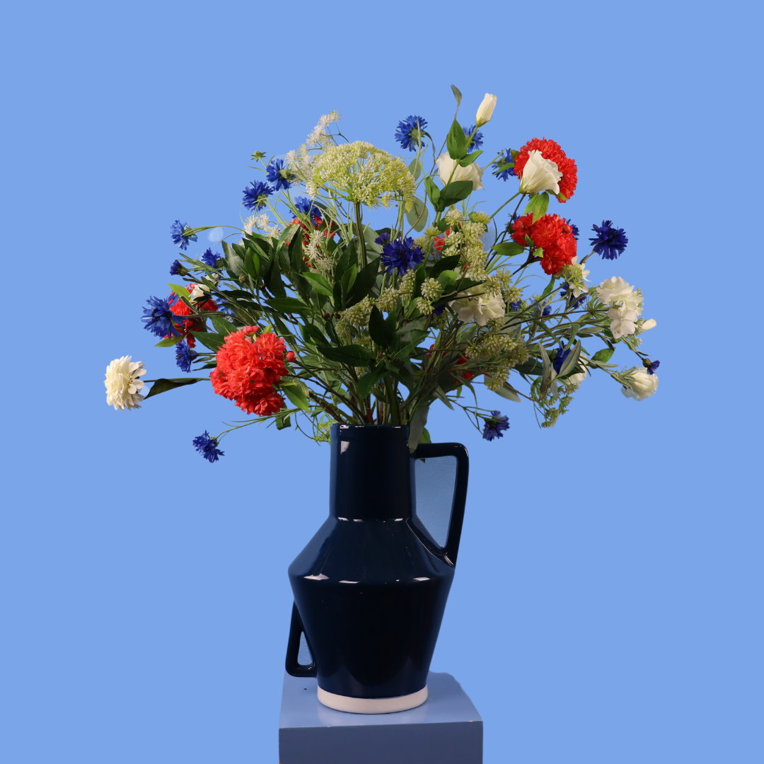 Prachtige donkerblauwe Return to Sender vaas met rode, blauwe en witte bloemen.