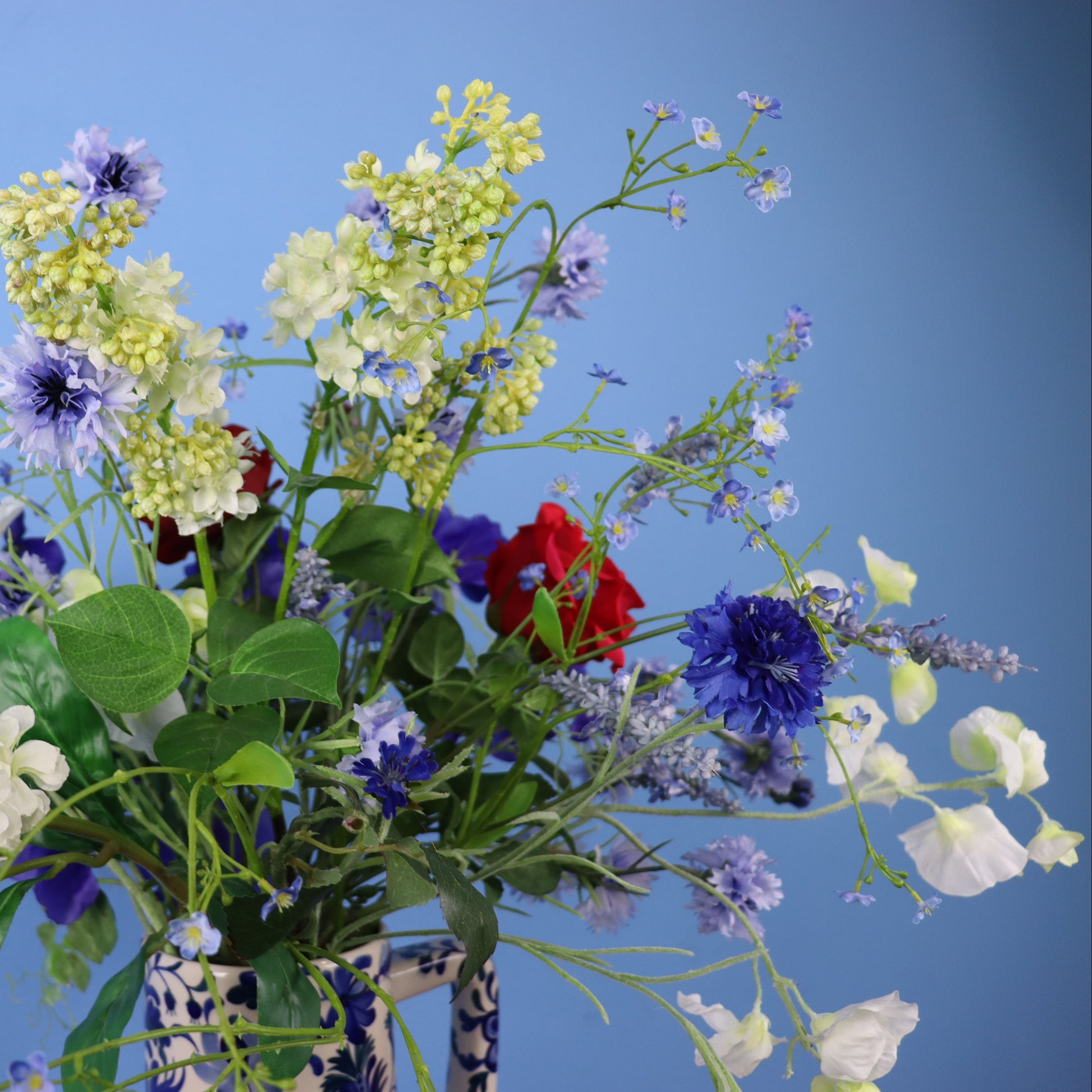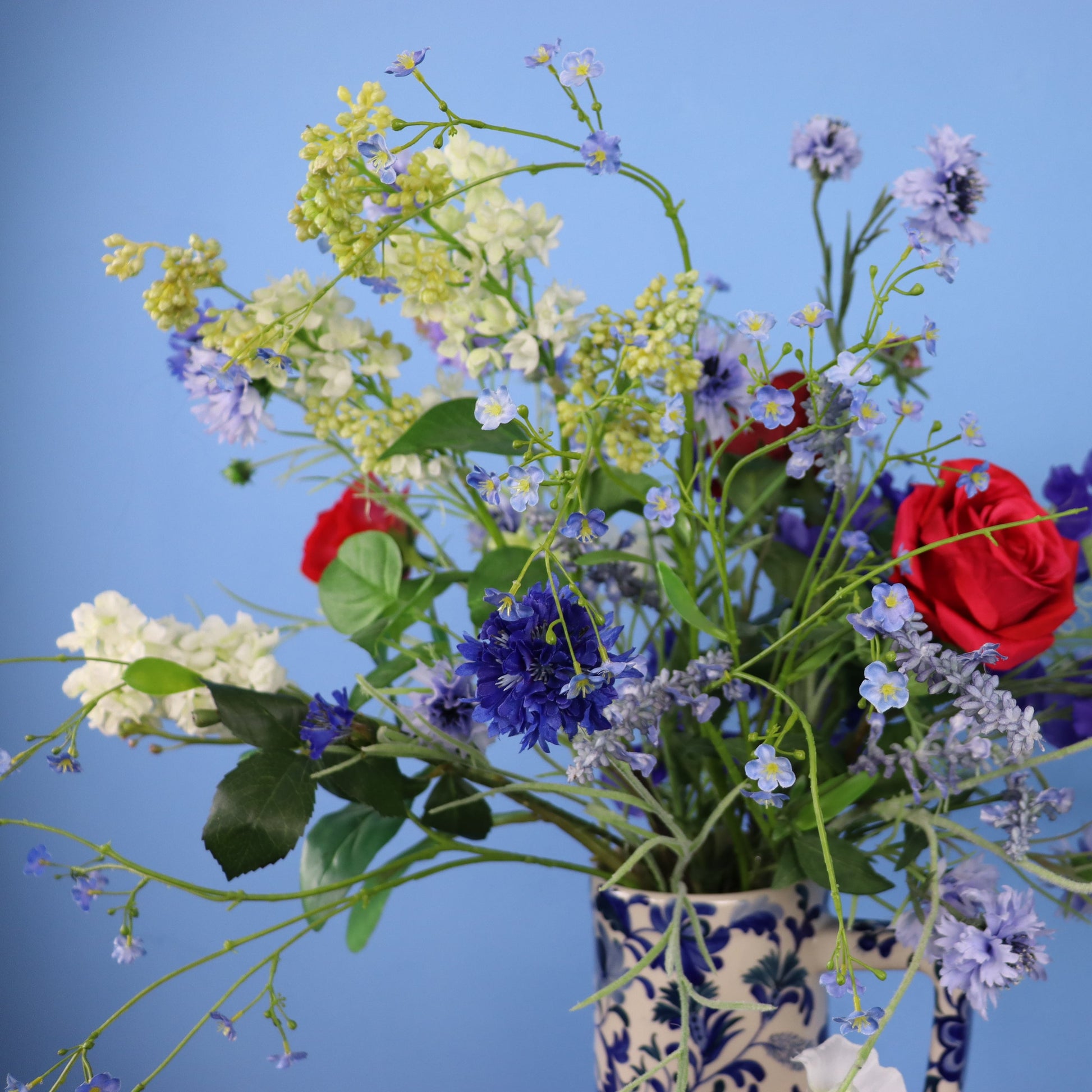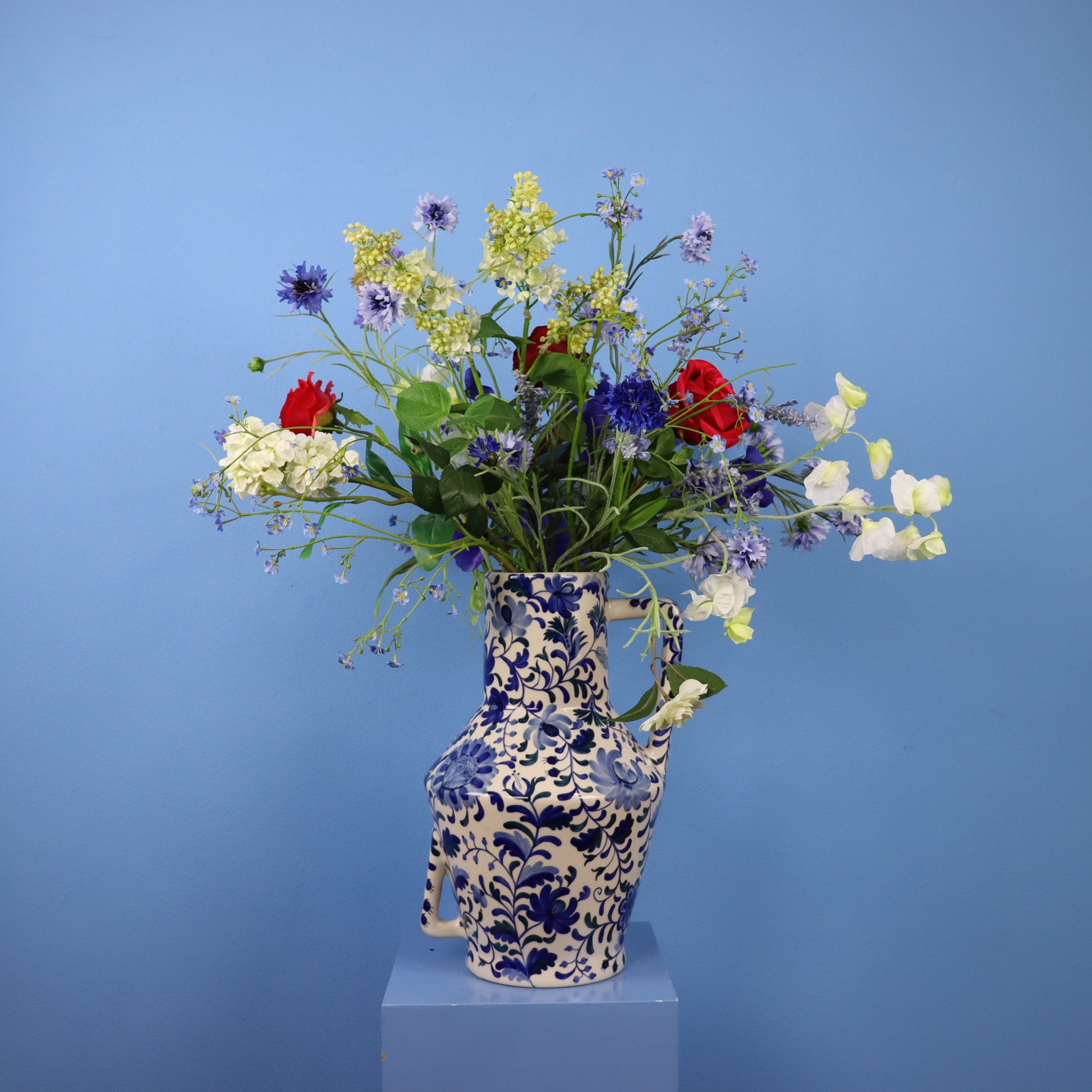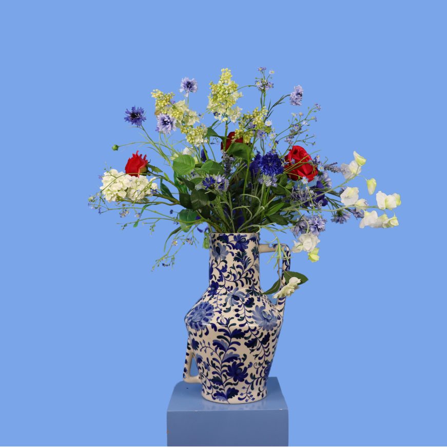 In deze Return to Sender vaas in het Delftsblauw zit een vrolijk boeket van blijvende bloemen.