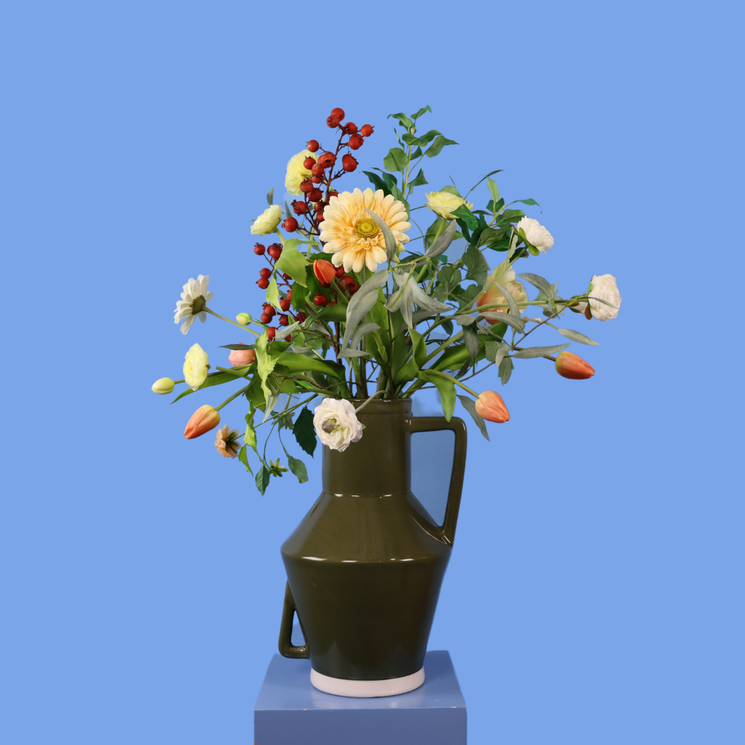 Deze donkergroene Return To Sender komt met een vrolijke bos bloemen.